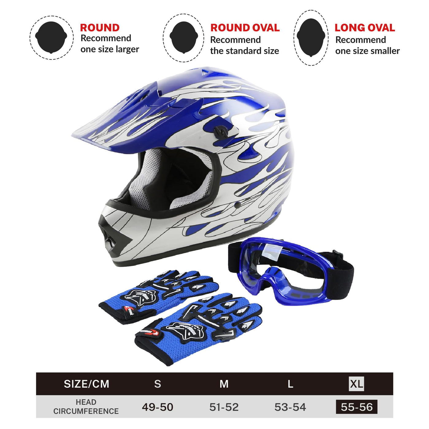 Youth Kids Motocross BMX MX ATV Dirt Bike Helmet ???Professional Grade Motorcycle Helmet? Meets or exceeds DOT FMVSS 218 standard. Exciting fashionable design with lots of advanced features. Exactly what you need for Street Bike, ATV, Dirt Bike, BMX and much more. For both boys and girls. ???Outstanding Materials:?Aerodynamic ABS Shell, Multi-Density EPS, Reinforced Chin Strap, Double D-Ring Buckle ???Ventilation System:?Fully adjustable intake and exhaust vents to create a constant, light flow of air helping to keep the rider cool and comfortable ???Comfortable Liner and Pads? Fully removeable and washable liner and pads to keep helmet clean, fresh. Extra space for Glasses. ???Best Children's Gifts Choice?Great for Youth Kids Dirt Bike, Off-road, Street Riding, Etc, Absolutely a Sweet Birthday/christmas Gift for Children. Size Chart: ???Helmet Size: S; Child(cm): 49-50; Inches: 19.28''-19.68''?; ???Helmet Size: M; Child(cm): 51-52; Inches: 20.07''-20.47''?; ???Helmet Size: L; Child(cm): 53-54; Inches: 20.86''-21.26''?; ???Helmet Size:XL; Child(cm): 55-57.15; Inches: 21.65''- 22.5''? ??Goggles Size: One Size(Youth) ??Gloves Size: One Size(Youth) PACKAGE INCLUDED: ??1x Motorcross Helmet ??1x Motorcross Goggles ??2x Motorcross Gloves ??1x Helmet Bag Note: Please measuring your head before bidding.Take a head measurement with a cloth tape measure. Wrap tape measure around your head one inch or 25mm or 2.5cm above your eyebrows,directly above your ears and to the widest area at the back of your head. The widest measurement will give you your helmet size.
