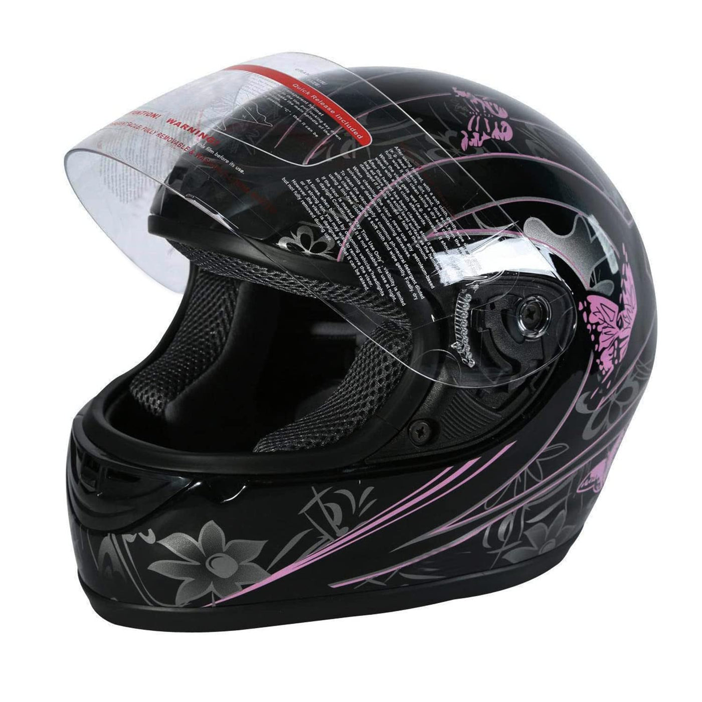 Description Condition: Brand New Main Color: Black/Pink Helmet Size: Large (Adult) Helmet Features: Beautiful glossy UV protective finished Light weight extremely durable composite shell Heavily cushioned and very comfortable interior Removable and washable padding, adjustable circulation vents with flip-up visor Well vented all purpose product for summer or winter riding DOT Safety Standard Comes with a Helmet Bag New In Box NOTE: Please MEASURE YOUR HEAD Before Bidding A small metal tape measure, or a cloth tape may be used to make your initial measurement. The circumference of the head should be measured at a point approximately one inch above the eyebrows in front, and at a point in the back of the head that results in the largest possible measurement. Full-Face Helmet Size Chart: Sm = 55-56 cm =21 1/2 - 22 Inches ; Md = 57-58 cm =22 1/4 - 22 3/4 Inches ; Lg = 59-60 cm = 23 - 23 1/2 Inches ; XL = 61-62cm = 23 3/4 - 24 1/4 Inches ; XXL= 63-64 cm = 24 3/4 - 25 Inches. SIZE GUIDE: To ensure proper sizing, please do the following: Take a head measurement with a cloth tape measure. Wrap tape measure around your head one inch or 25mm or 2.5cm above your eyebrows,directly above your ears and to the widest area at the back of your head. The widest measurement will give you your helmet size. If you donthave a tape measure, you can use a piece of string and measure using a ruler. PACKAGE INCLUDED: - 1x Helmet - 1xHelmet Bag