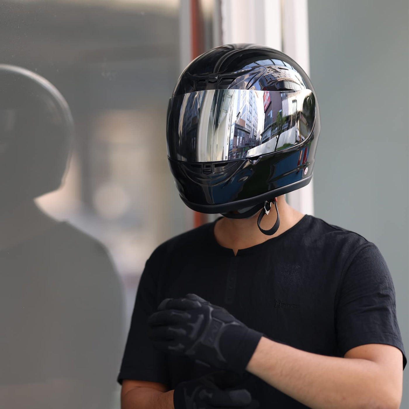 Adult Full Face Mirror Shield Motorcycle Street HelmetSPECIFICATIONS? Condition: Brand New Main Color: Gloss Black FEATURES: Meets DOT Safety standards! Sleek design and lightweight Injection molded Polycarbonate and Thermoplastic composite shell Front anti-fog, anti-scratch and wide visual field Mirror Shield Removable helmet liner and cheek pads lightweight, soft and easily removable and washable Full front to back airflow ventilation Breath guard Padded chin strap with D-ring closure and strap keeper Comes with a Helmet Bag New In Box NOTE: Please MEASURE YOUR HEAD Before Bidding! Full-Face Helmet Size Chart: Md = 57-58 cm=22 1/4 - 22 3/4 inches; Hat Size: 7 1/8 - 7 1/4 Lg = 59-60 cm=23 - 23 1/2 inches; Hat Size: 7 3/8 - 7 1/2 XL= 61-62 =23 3/4 - 24 1/4 inches; Hat Size: 7 5/8 - 7 3/4 SIZE GUIDE To ensure proper sizing, please do the following: Take a head measurement with a cloth tape measure. Wrap tape measure around your head one inch or 25mm or 2.5cm above your eyebrows,directly above your ears and to the widest area at the back of your head. The widest measurement will give you your helmet size. If you dont have a tape measure, you can use a piece of string and measure using a ruler.PACKAGE INCLUDED: - 1x Helmet - 1 x Helmet Bag