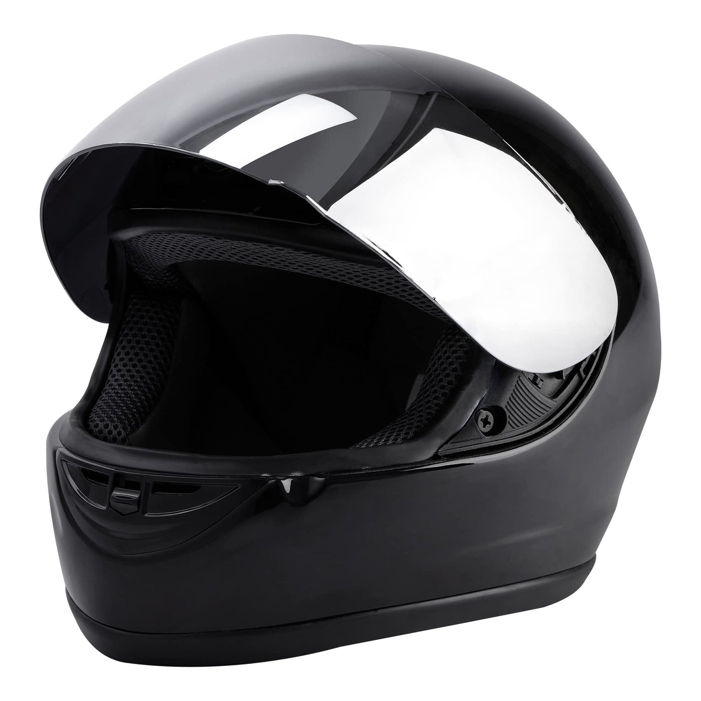 Adult Full Face Mirror Shield Motorcycle Street Helmet ? SPECIFICATIONS? Condition: Brand New Main Color: Gloss Black ? FEATURES: ? Meets DOT Safety standards! Sleek design and lightweight Injection molded Polycarbonate and Thermoplastic composite shell Front anti-fog, anti-scratch and wide visual field Mirror Shield Removable helmet liner and cheek pads lightweight, soft and easily removable and washable Full front to back airflow ventilation Breath guard Padded chin strap with D-ring closure and strap keeper Comes with a Helmet Bag New In Box ? NOTE: Please MEASURE YOUR HEAD Before Bidding! ? Full-Face Helmet Size Chart: ? Md = 57-58 cm=22 1/4 - 22 3/4 inches; Hat Size: 7 1/8 - 7 1/4 ? Lg = 59-60 cm=23 - 23 1/2 inches; Hat Size: 7 3/8 - 7 1/2 ? XL= 61-62 =23 3/4 - 24 1/4 inches; Hat Size: 7 5/8 - 7 3/4 ? SIZE GUIDE To ensure proper sizing, please do the following: Take a head measurement with a cloth tape measure. Wrap tape measure around your head one inch or 25mm or 2.5cm above your eyebrows,directly above your ears and to the widest area at the back of your head. The widest measurement will give you your helmet size. If you dont have a tape measure, you can use a piece of string and measure using a ruler. ? PACKAGE INCLUDED: - 1x Helmet - 1 x Helmet Bag