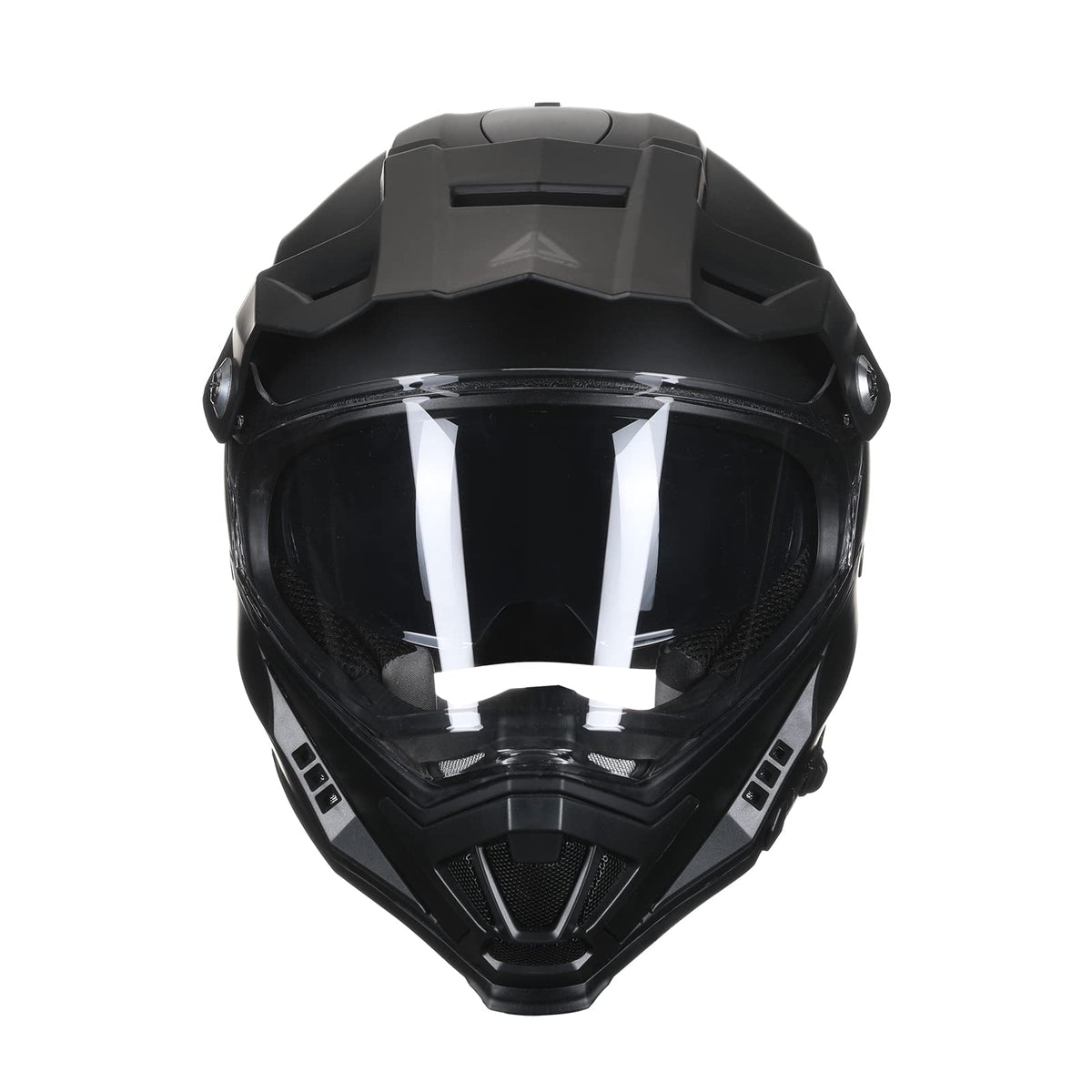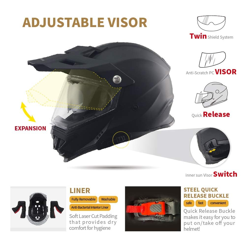 TRIANGLE Dual Visor Full Face Off-Road Helmet Dual Sport Motorcycle Motocross ATV Dirt Bike Helmets DOT ApprovedSix AdvantagesDual Visor:Inner tinted lens + clear outer lens provide wide shield clear view>br>Detachable Top Sun Visor:The top sun visor can be taken off and you can get a full face helmet Well Vented: three ventilation channel, provides sufficient air flow, making the driving experience comfortable Safety Performance Guarantee: Light weight durable aerodynamic thermoplastic alloy shell, DOT & ECE approved,ensures the quality and safety Comfortable Inner Padding: With a thick, high density and fully vented EPS liner, brings you a better protection as well as comfortable wearing Nose Guard:Equipped with nose guard,It has a good protective effect.