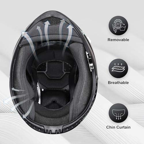 PROTECTION: meets or exceeds DOT FMVSS-218 safety standards. Advanced ABS shell secure a motorcycle rider. Quick disconnect clasp and strap help users easily open with one hand. This motorcycle helmet provides top-notch protection and convenience for riders. VENTILATION SYSTEM: Multi vents, streamlined aerodynamic design which reduces wind noise and drag. The advanced ventilation system ensures proper airflow, minimizing wind noise and enhancing comfort during rides. REMOVABLE & HIGH DENSITY: Equipped with fully removable washable padding. The high density fully vented EPS liner greatly absorbs impact to the rider. A removable and washable padding ensures easy maintenance and cleanliness, while the high-density EPS liner provides excellent impact absorption for enhanced safety. DUAL VISOR & UV PROTECTION: Dual lens design (anti-fog and wide view outer visor and inner sun shield) and beautiful glossy UV protective finish. The dual visor design ensures clear vision and protection against harmful UV rays. The glossy UV protective finish adds a stylish touch to the helmet. IMPORTANT SIZING NOTE: Please measure your head carefully before ordering. The sizing information can only be used as a guide and does not guarantee a perfect fitment. If you wear glasses, we suggest a larger size. Contact us if there are any sizing questions. Customers can return or change products without giving a reason within seven days. Simply send us a message on Amazon or email us directly. ORDER IT NOW!