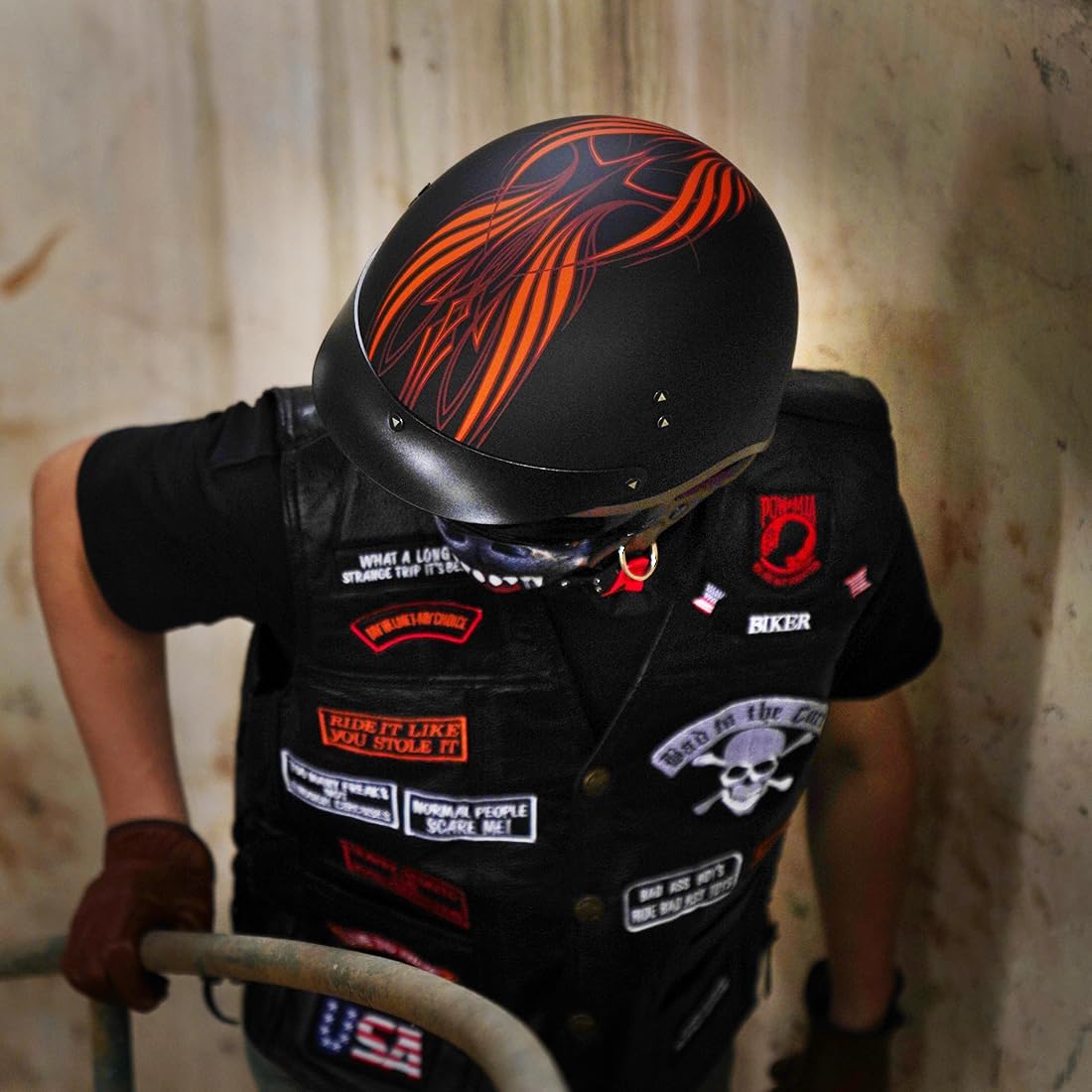 THE WARRIOR MOTORCYCLE HALF HELMET - STYLISH VALUE PACKED PROTECTION. The newly designed Rebel Warrior motorcycle half helmet is the ideal choice for motorbike riders looking for a more comfortable and stylish ride with its technology-loaded design, lightweight half face coverage, and cool comfortable fit. Show off your USA pride with the aggressive patriotic flag design or choose one of the solid colors for a more streamlined look. The Rebel Warrior skull cap helmet is perfect for both men & women and loaded with features that offer you a more comfortable, custom fitting beanie motorcycle helmet. REBEL WARRIOR MOTORCYCLE HALF HELMET FEATURES: Fully vented high density EPS liner for increased strength, cooling, & safety. Optically correct, multi-position drop down sunshield protects from sun, bugs & rain. Comfort Tech Wick-Dri Liner System. Weighs only 2.4 pounds, eliminating neck fatigue on those long trips with your motorcycle, scooter, moped, cruiser, UTV, ATV, touring bike, or other street bike. Padded quick release strap system. New custom fit dial adjuster for the perfect custom fit - great for those hard to fit smaller heads. Every batch of helmets are randomly tested to ensure safety standards are met. 3 year limited warranty & guaranteed to be free from defects in materials & craftsmanship for the lifetime of the helmet.**See Vega website for full warranty details. Sizing: Measure the circumference of your head 1'' above your eyebrows & around the largest portion of the back of your head: - X-Small: 19.50 - 21.26 - Small: 21.65'' - 22.05'' - Medium: 22.44'' - 22.83'' - Large: 23.23'' - 23.62'' - X-Large: 24.02'' - 24.41'' - XX-Large: 24.80'' - 25.20 The Rebel Warrior Motorcycle Half Helmet by VCOROS Helmets is back due to popular demand and read