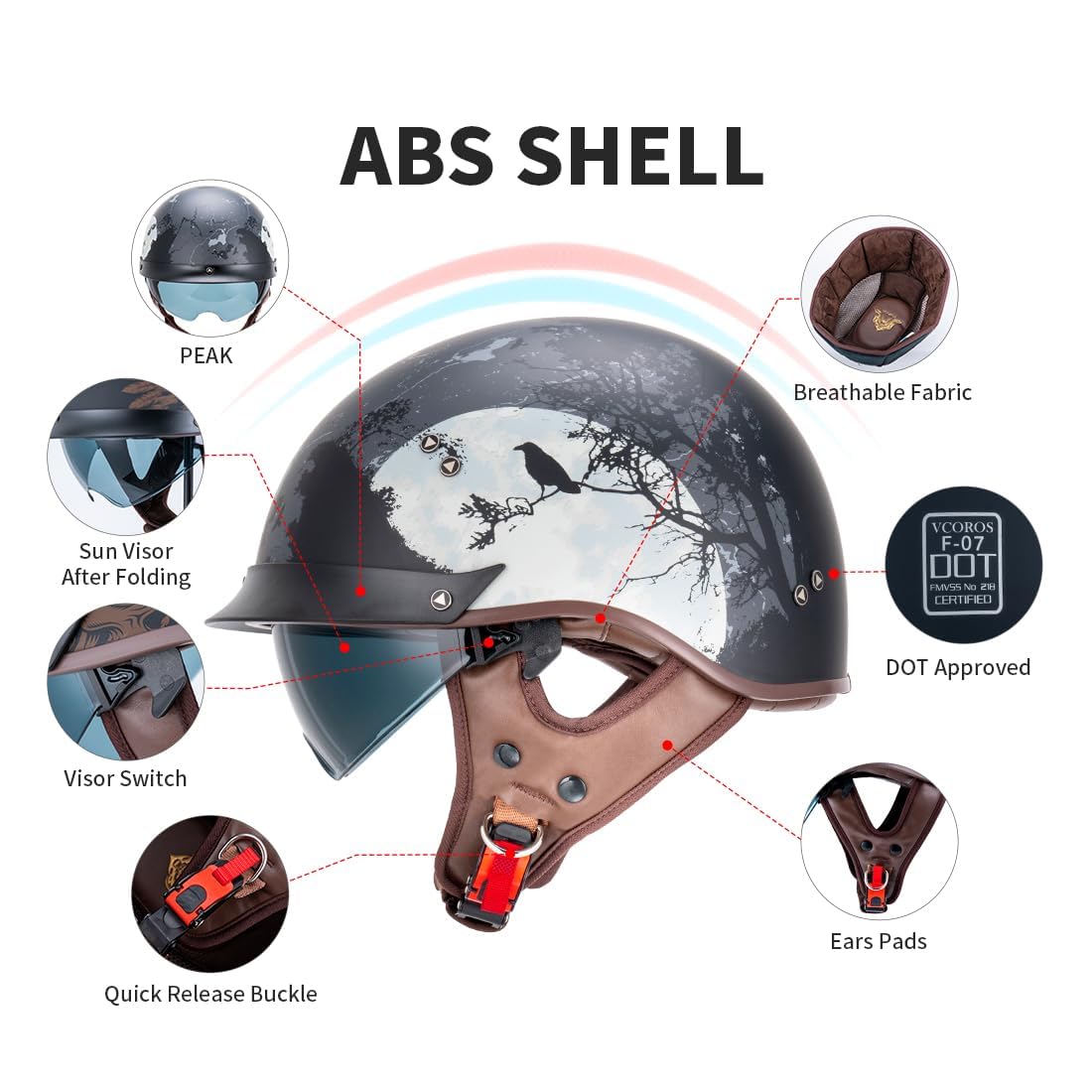 Vcoros Motorcycle Half Face Helmet Sun Visor Quick Release Buckle Dot Approved Helmets For Men Women (Dark Night, Xxl)