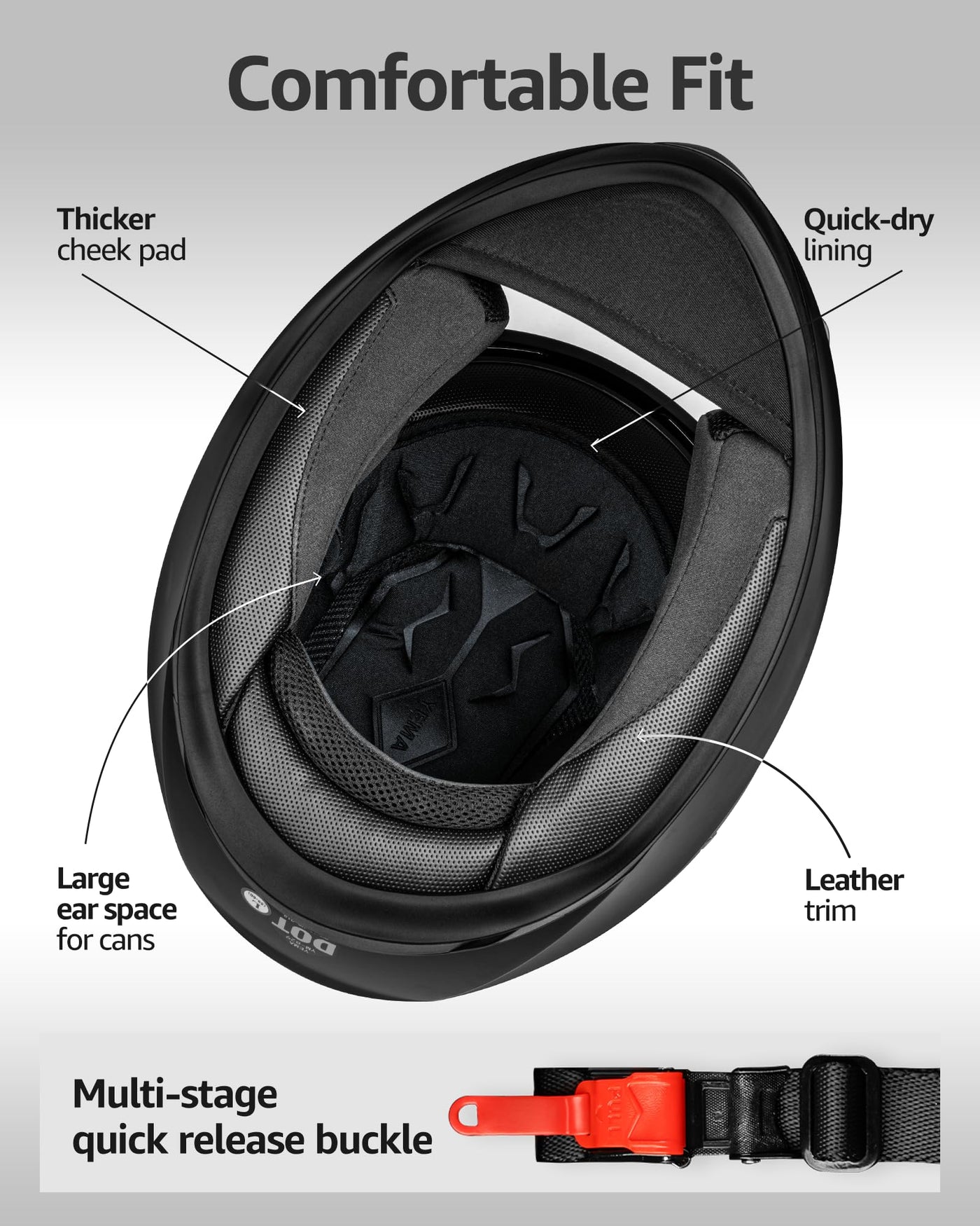 Professional Grade Motorcycle Helmet: Meets or exceeds DOT FMVSS 218 standard. Exciting fashionable design with lots of advanced features. Exactly what you need for Street Bike, Racing, Cruiser, Scooter and much more. For both men and women. Outstanding Materials: Aerodynamic ABS Shell, Multi-Density EPS, Reinforced Chin Strap, Quick Release Buckle. Ventilation System: Fully adjustable intake and exhaust vents to create a constant, light flow of air helping to keep the rider cool and comfortable. Comfortable Liner and Pads: Fully removeable and washable liner and pads to keep helmet clean, fresh, and odor free. Extra space for Glasses (Not included). Sun Visor System: Easy-use switch for quick change of sun visor. Tool-Free to remove and install clear visor.