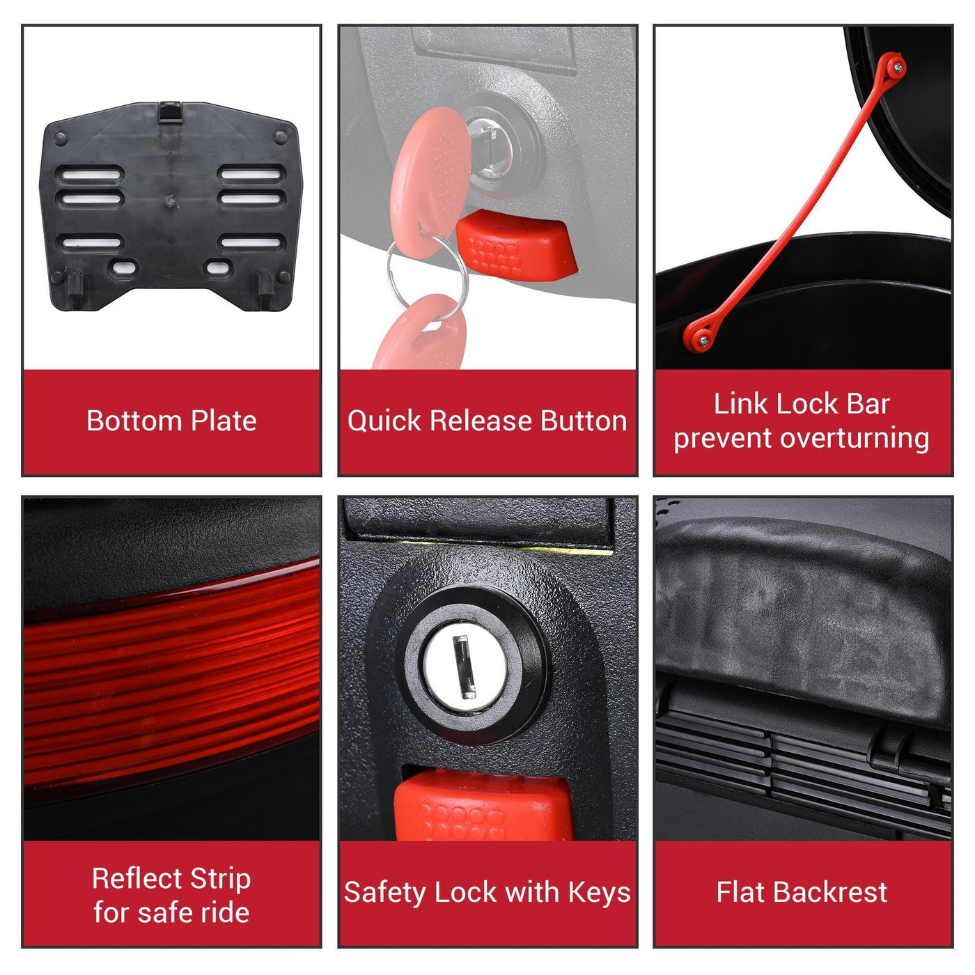 Features:- Universal Tail Box - 18'' x 15'' x 11'' Motorcycle Tour Tail Box features 30 L large capacity for easy fitting a large sized helmet or carrying your necessary gears like raincoats or water bottles; With a universal mounting plate allows to attach the tail box to motorbikes, scooters or other motorcycles with frame; Suitable for commuters or travelers- Quick Release Button - With a quick release button helps to easily detach the tail box from the bottom plate, allowing you to take it out and conveniently carry with your personal items wherever you go- Durability - Made of PP material, it provides wear and impact resistance, offering strong support for bearing heavy loads, ensuring a long lifespan- Safety Assurance - Reflective strip on the tail box makes it visible when riding at night, providing a safe ride; Safety lock with 2 keys adds security to your personal items without theft; Flat backrest offers support to rest your back- Easy to Install - Easy to install the universal mounting plate with included screws, no need to drill, then simply attach and secure the tail box with 1 buttonSpecifications:- Overall Dimension: 17 11/16'' x 15 3/8'' x 11'' (45 x 39 x 28 cm)- Maximum Internal Length: 15 3/4'' (40 cm)- Minimum Internal Length: 11 1/4'' (28.5 cm)- Internal Diagonal Length: 16 15/16'' (43 cm)- Inner Height: 5 7/8'' (15 cm)- Bottom Plate Size(LxW): 11 7/16'' x 9 1/16'' (29 x 23 cm)- Bracket Length: 7 1/16'' (18 cm)- Capacity: 30 L- Material: PP- Net Weight: 6.6 Lbs (2.99 kg)Package Contents:- 1x Tail Box- 1x Bottom Plate- 2x Keys- 2x Brackets- 4 Sets of Screws- 1x ManualNotice: - Before purchasing, please measure your helmet size and make sure the height of your helmet is less than 9 13/16''.