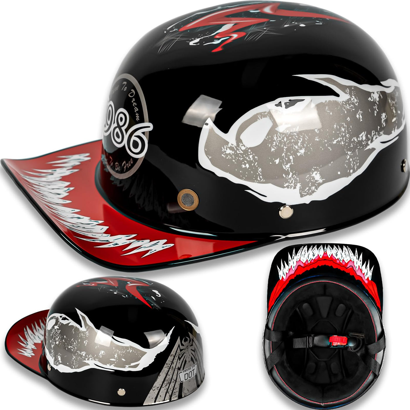 YESMOTOR Novel & Stylish Baseball Cap Helmet Design | HIGH STRENGTH & LIGHT WEIGHT - ABS shell, EPS liner for a safe and comfortable experience | QUICK RELEASE STRAPS - end the ride, pull the chin strap to remove the helmet | BREATHABLE COMFORT - The soft inner lining provides excellent helmet wearing comfort and the cleanable inner lining keeps the inside of the helmet clean. | UNIQUE DESIGH - Strong and highly elastic front visor for excellent impact resistance, streamlined aerodynamic design-reducing wind noise and resistance