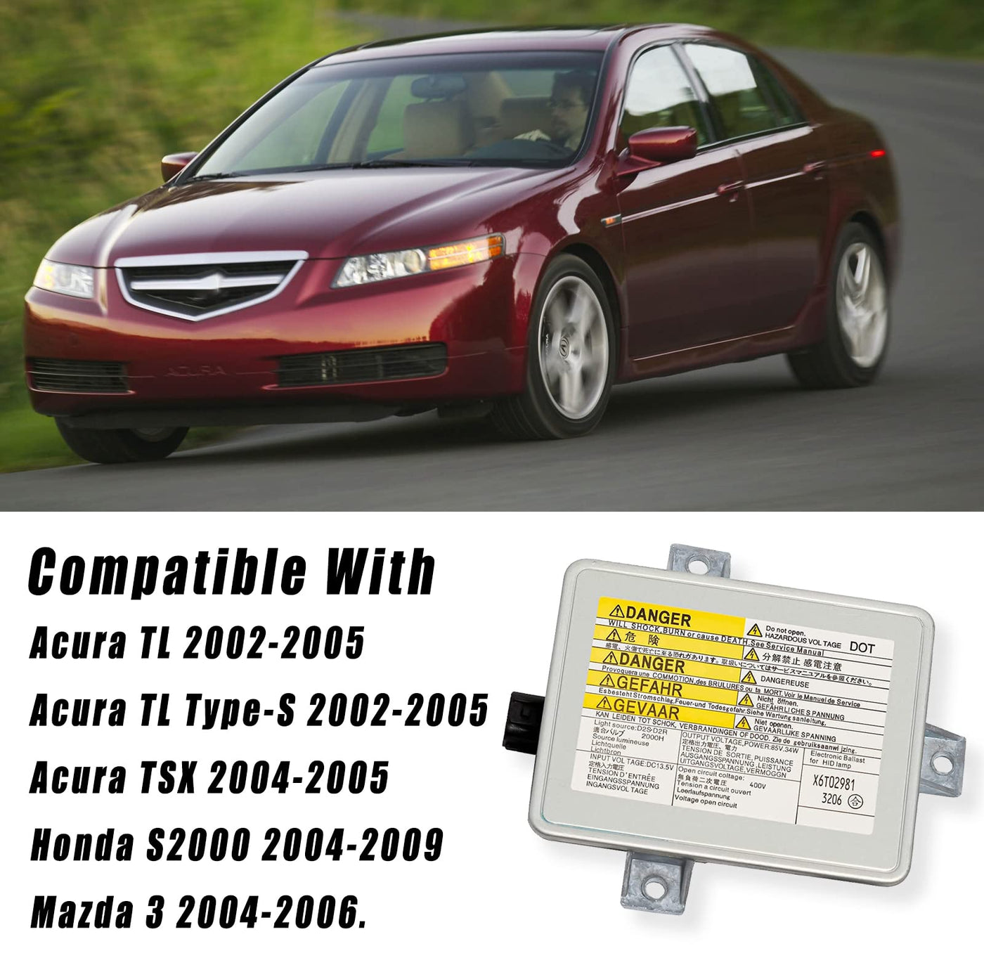 Q: What vehicles are compatible with the Boine Xenon HID Headlight Ballast?A: The Boine Xenon HID Headlight Ballast is compatible with the following vehicles: Acura TL (2002-2005), Acura TL Type-S (2002-2005), Acura TSX (2004-2005), Honda S2000 (2004-2009), and Mazda 3 (2004-2006).