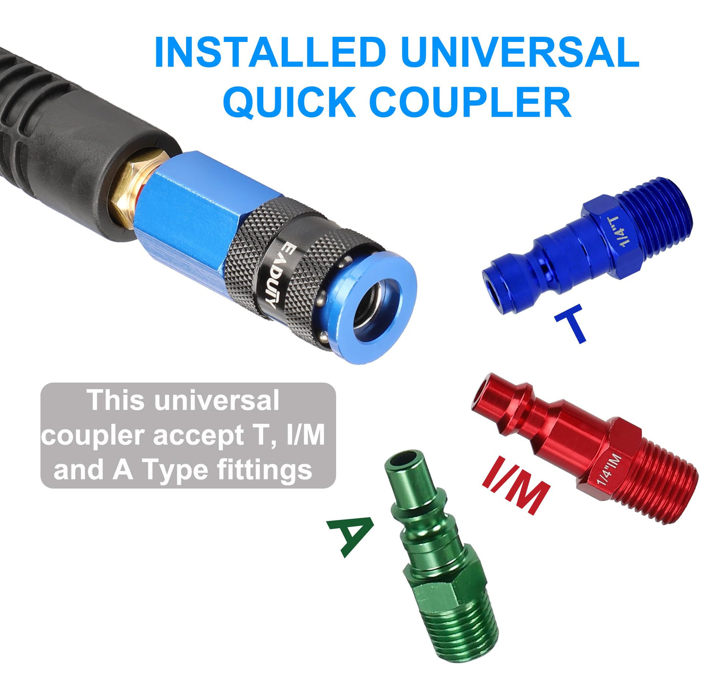Q: Is this air hose compatible with various air tools?A: Yes, the EADUTY air hose comes with a universal quick coupler that fits I/M, T, and ARO type plugs, making it highly compatible with various air tools such as blowguns, nailers, and spray guns.