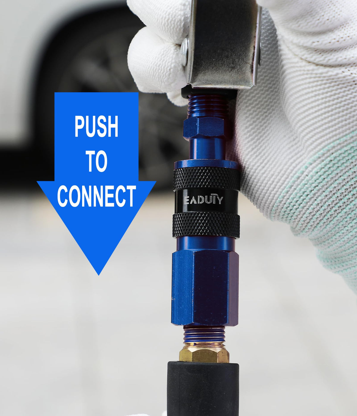 Q: What type of quick coupler is included with the hose?A: The EADUTY air hose comes with an AMT universal quick coupler that is compatible with I/M, T, and ARO type plugs, allowing for easy connection to different air tools.