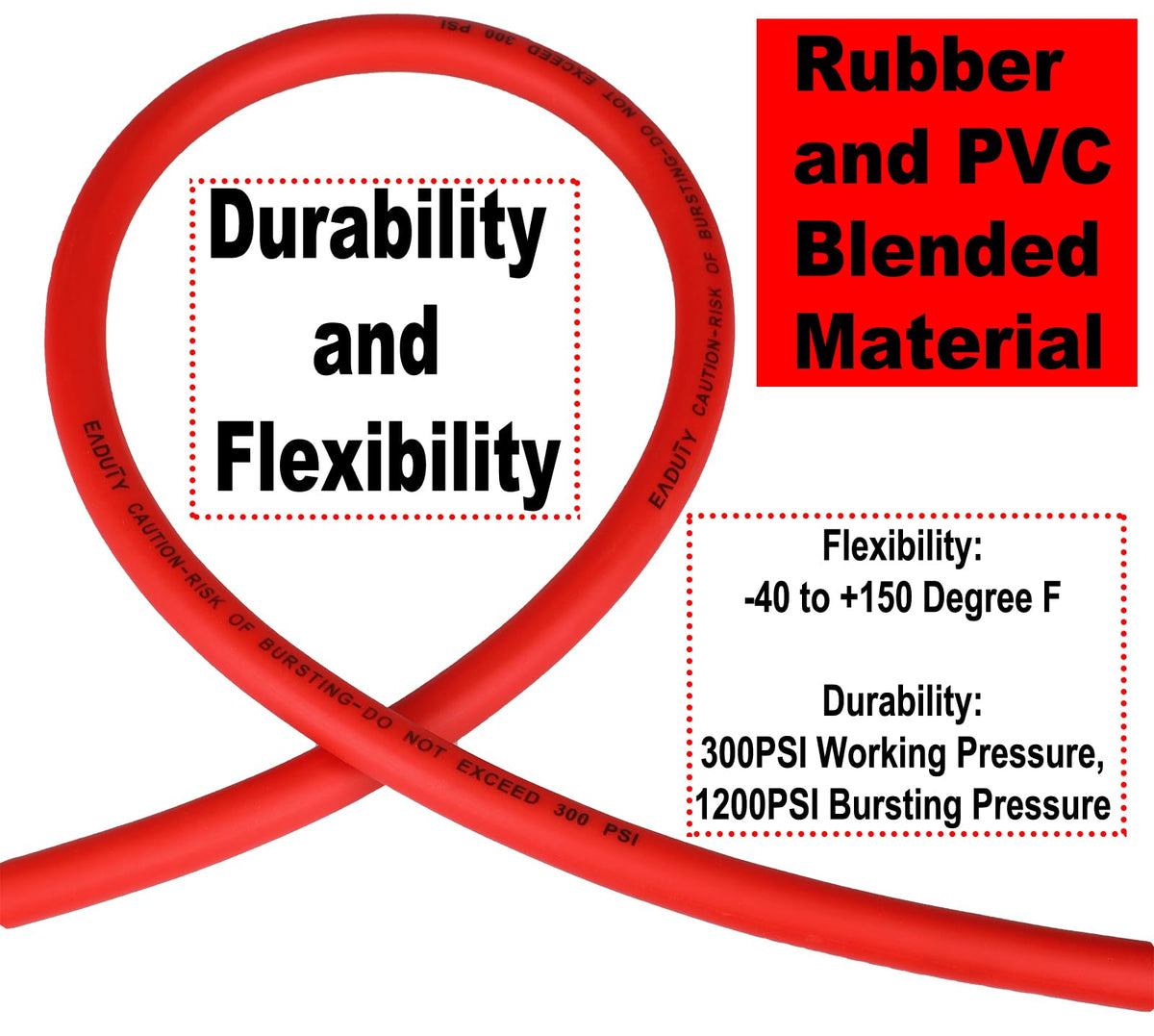 Q: What materials are used in the construction of the EADUTY Hybrid Air Hose?A: The hose is made from a durable blend of rubber and PVC, providing lightweight, abrasion-resistant, and kink-resistant properties.