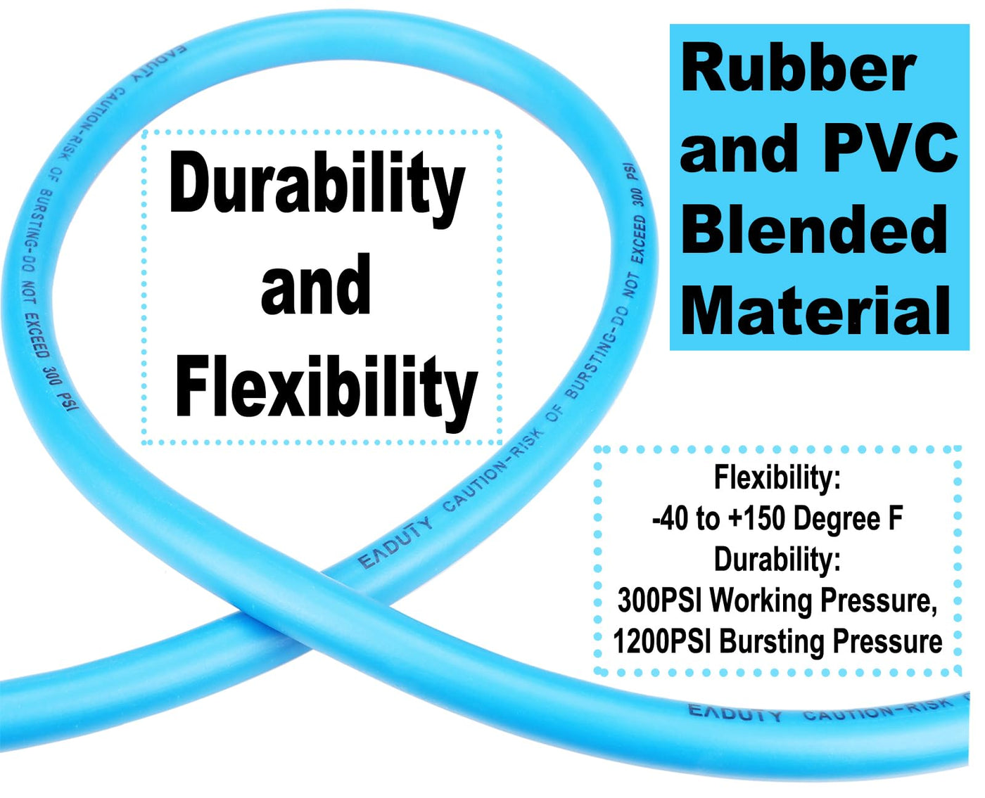 Q: What materials are used in the construction of the EADUTY air hose?A: The EADUTY Hybrid Lead-in Air Hose is made from a blended material of rubber and PVC, providing durability, lightweight characteristics, and abrasion resistance.
