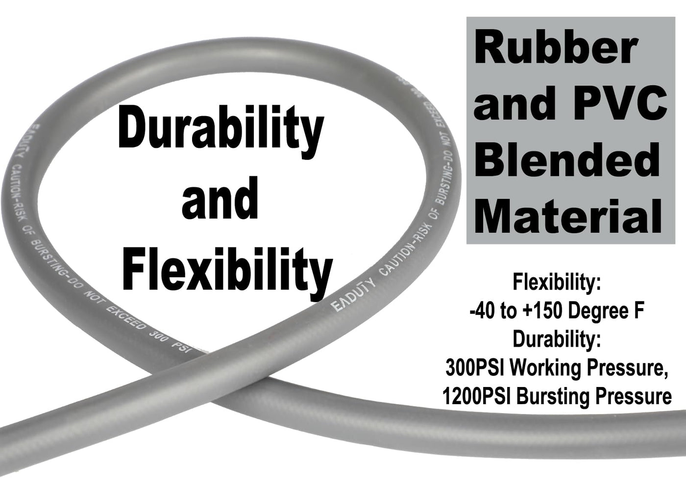 Q: What materials is the EADUTY air hose made from?A: The EADUTY air hose is made from a hybrid material that blends rubber and PVC, providing durability, lightweight properties, and resistance to kinking.