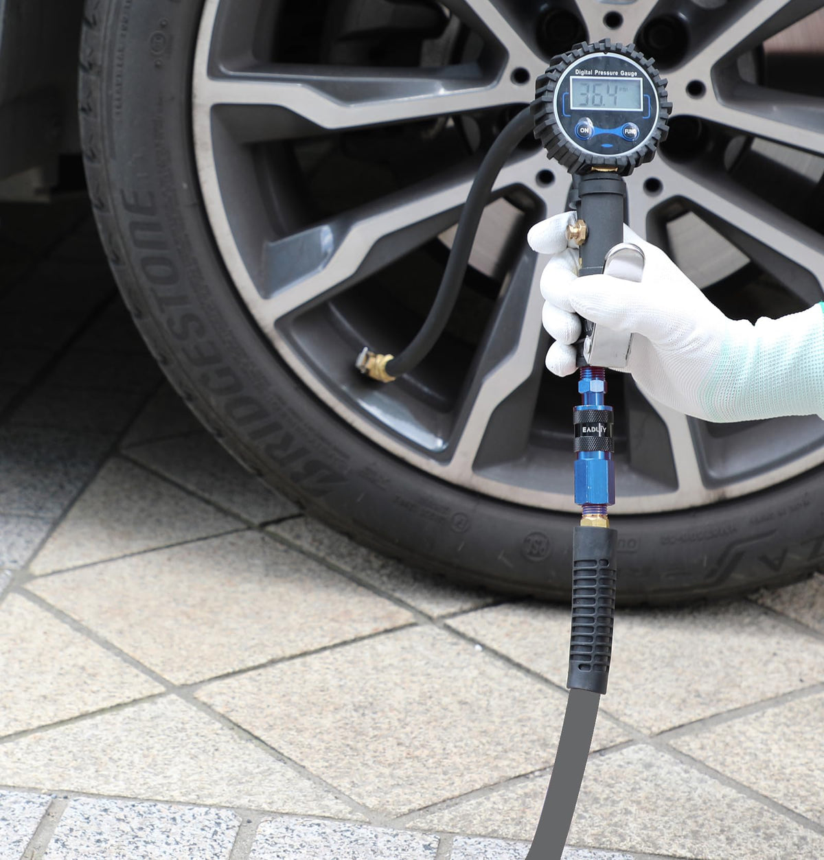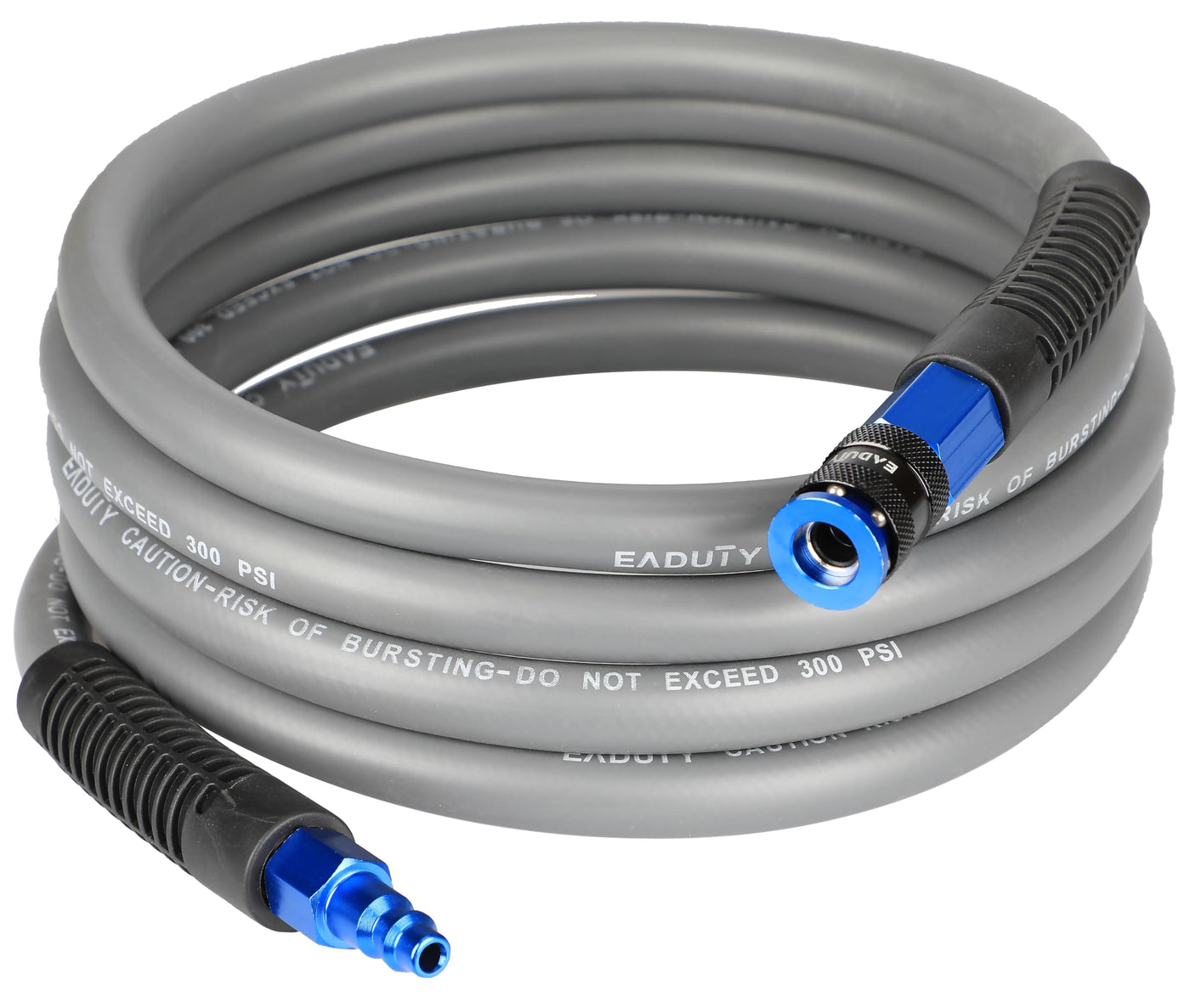 This EADUTY hybrid Air Hose is heavy-duty, lightweight, resist kinking and stay flat. It is 3/8-inch inner diameter by 10 foot long. This air compressor hose is flexible at -40 degree F for all weather use. Comes with 1/4' aluminum universal quick coupler and industrial plug for easily to connect air compressor and air tools. Bend restrictors reduce kinking and increase the life of the hose. Flexible at -40 to 150 degree F. Max working pressure is 300 PSI. Bursting Pressure is 1200 PSI.