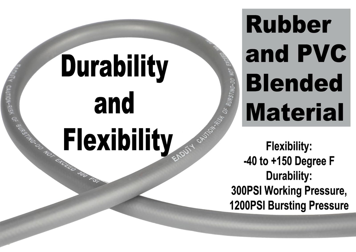 This EADUTY hybrid Air Hose is heavy-duty, lightweight, resist kinking and stay flat. It is 3/8-inch inner diameter by 3 foot long. This air compressor hose is flexible at -40 degree F for all weather use. Comes with 1/4' aluminum universal quick coupler and industrial plug for easily to connect air compressor and air tools. Bend restrictors reduce kinking and increase the life of the hose. Flexible at -40 to 150 degree F. Max working pressure is 300 PSI. Bursting Pressure is 1200 PSI.