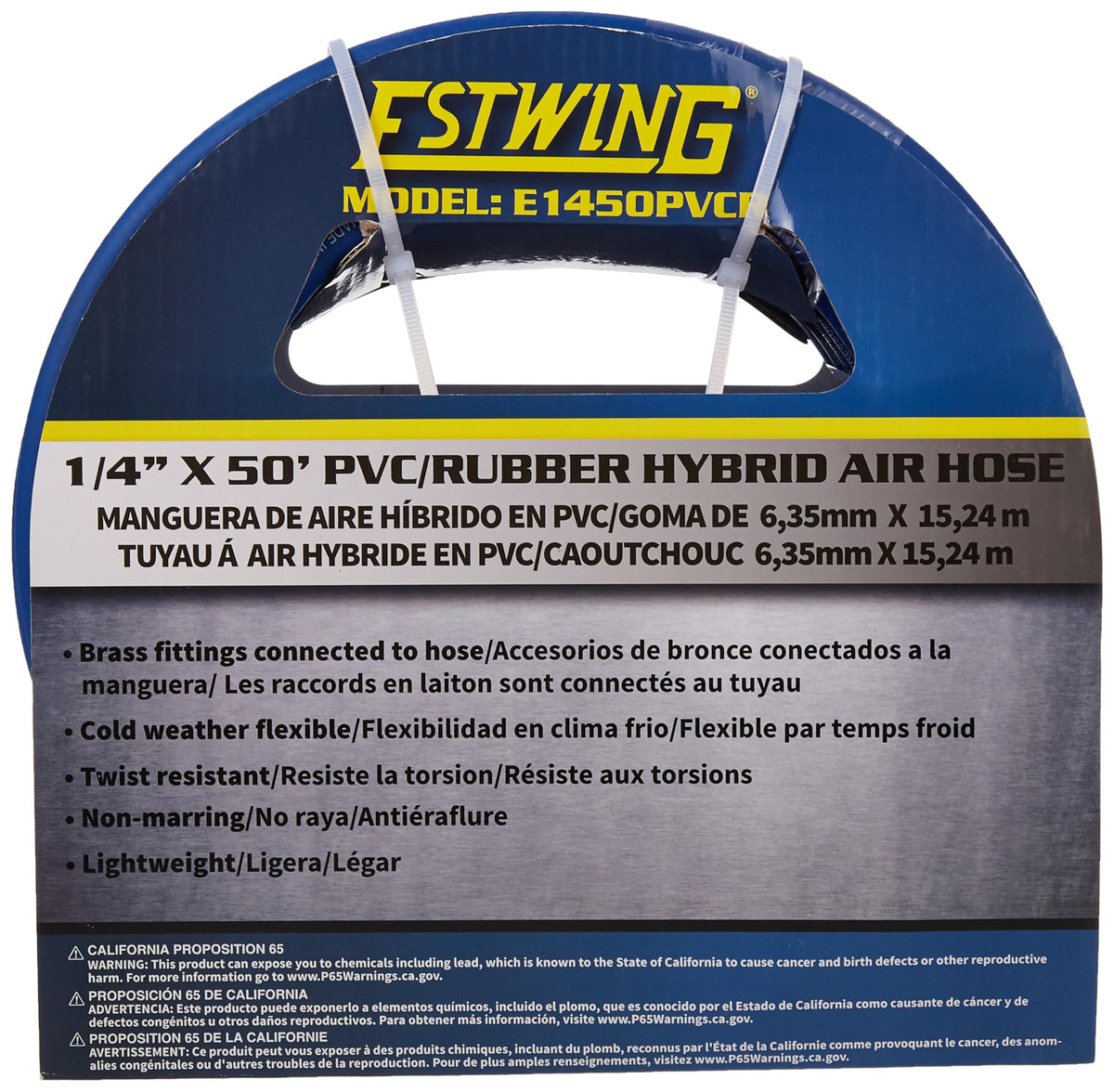 The Estwing E1450PVCR 1/4' x 50' PVC / Rubber Hybrid Air Hose with Brass 1/4' NPT Industrial Fitting and Universal Quick Connect Coupler is ideal for supplying compressed air to pneumatic tools and inflation accessories. This durable air hose is built to last and features rugged and lightweight PVC / rubber hybrid construction, bend restrictors at each end, a non-marring twist and kink resistant design, and all weather flexibility. Brass fittings are included to increase performance and durability. The 1/4' x 50' PVC / Rubber Hybrid Air Hose with Brass 1/4' NPT Industrial Fitting and Universal Quick Connect Coupler is perfect for DIYers tackling home improvement and repair projects as well as construction contractors at the jobsite, and is part of Estwing's professional line of pneumatic tools.