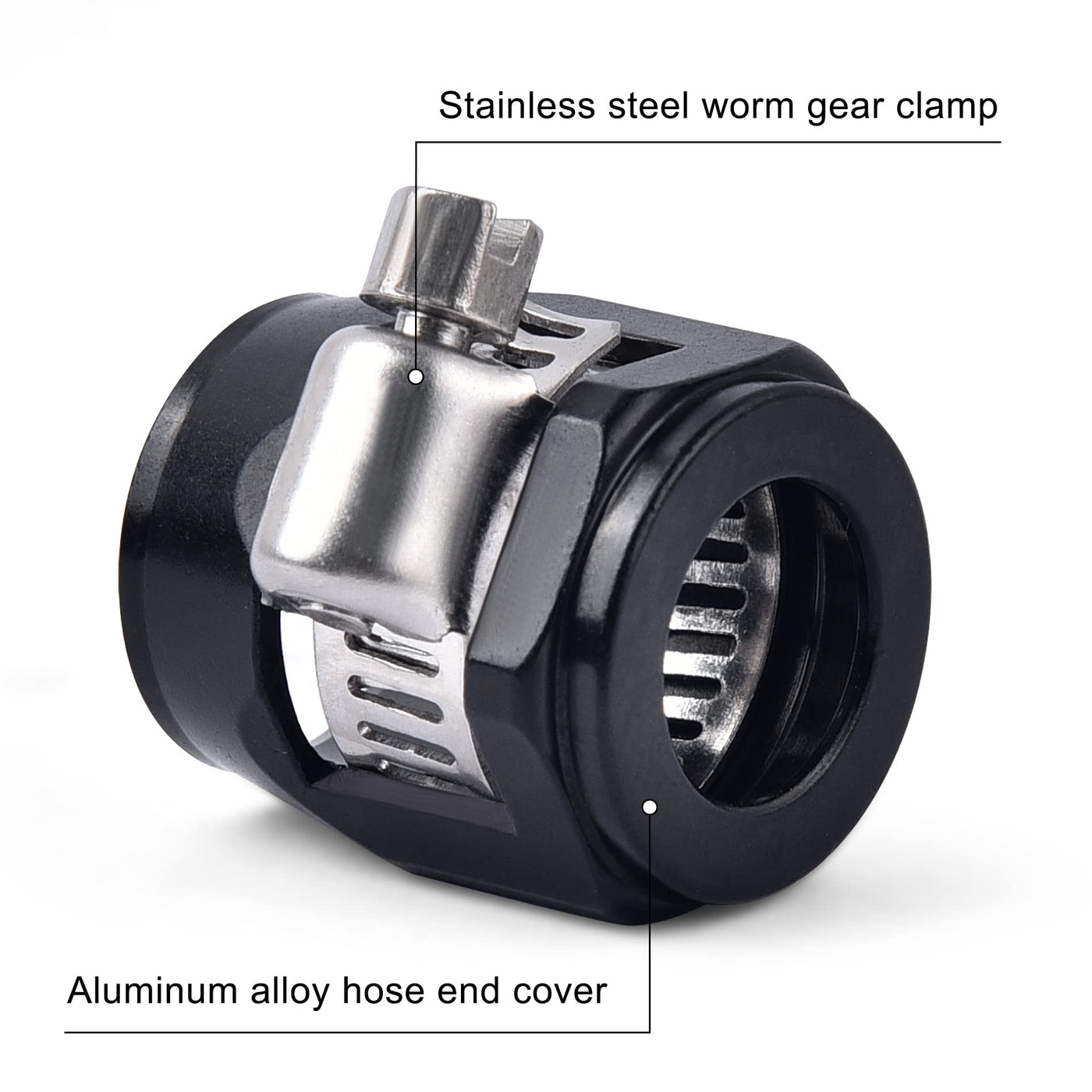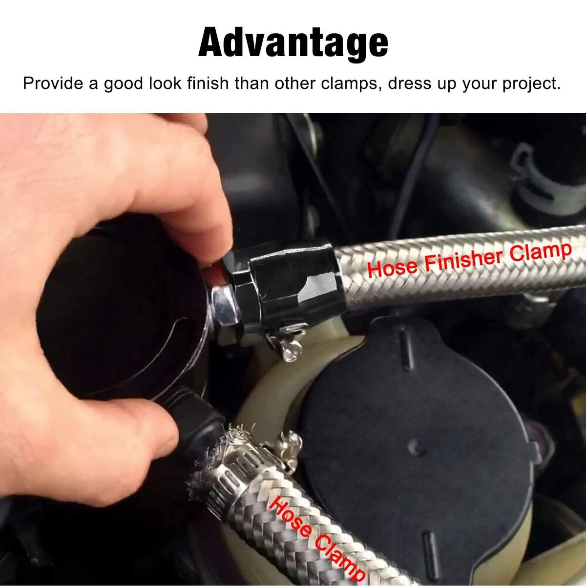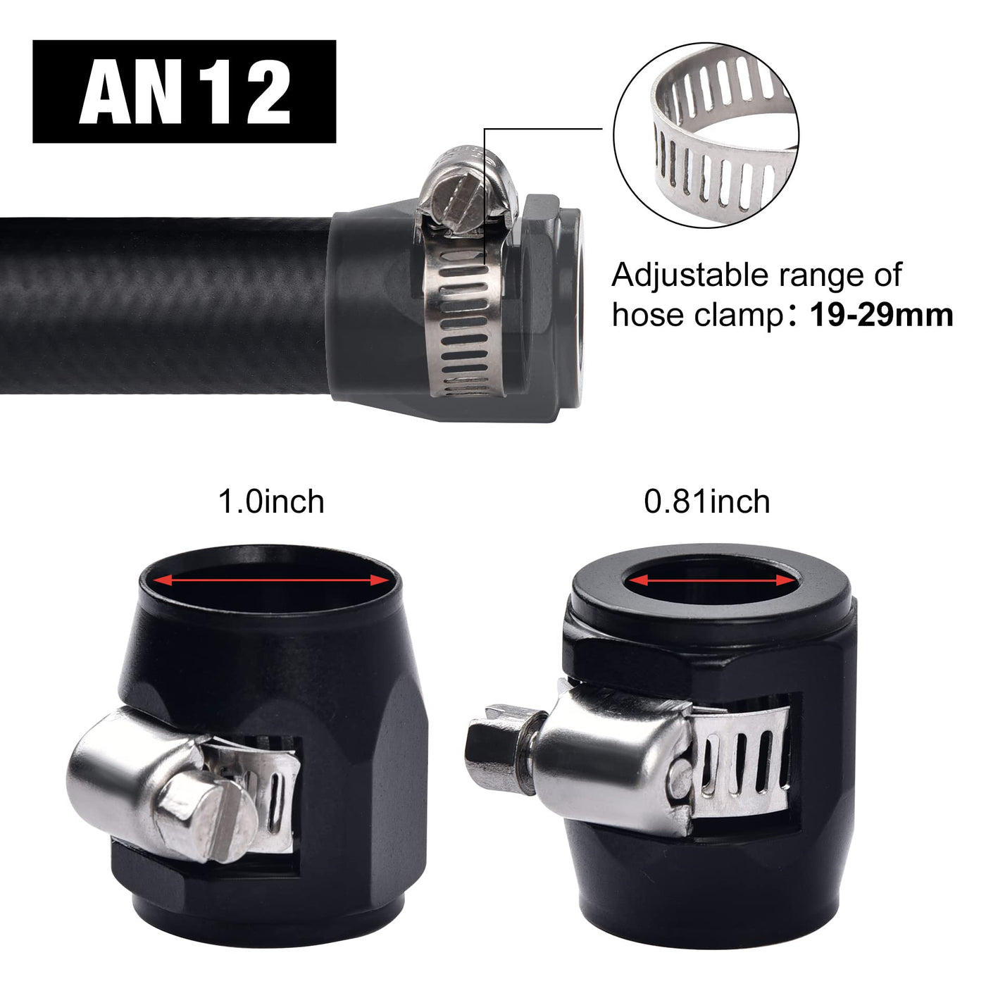 Q: What sizes do the EVIL ENERGY 12AN Hose Finisher Clamps accommodate?A: The EVIL ENERGY 12AN Hose Finisher Clamps have an adjustable range of 19-29mm (0.74"-1.14"), making them suitable for various hose sizes. It's important to measure the outer diameter of your hose before purchasing to ensure a proper fit.