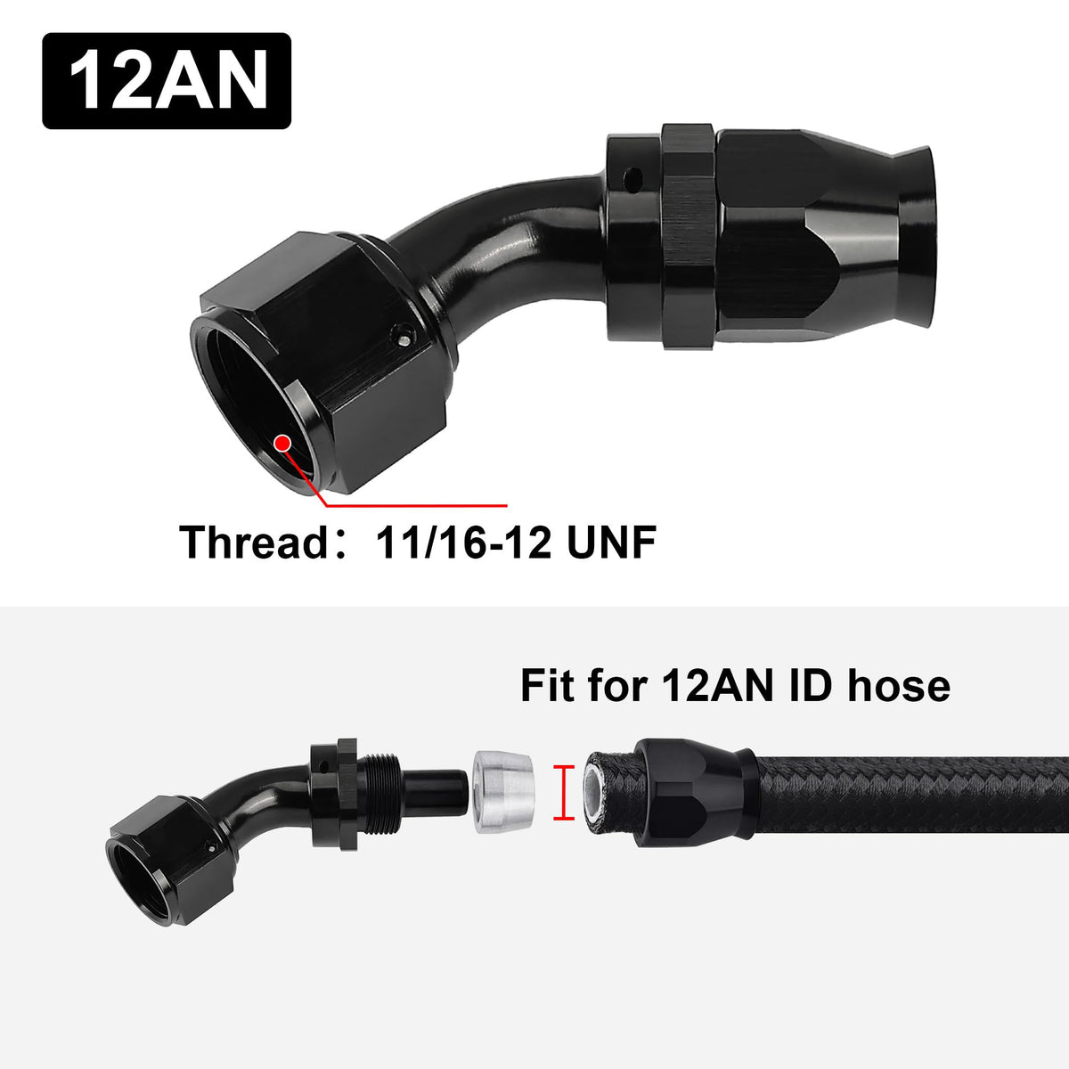 [Size] Thread Size of 12AN PTFE Fitting is 11/16-12 UNF. | [Application] The PTFE Hose End only work with PTFE fuel line. | [Parameter] Working pressure: 1500PSI. Temperature range: -65