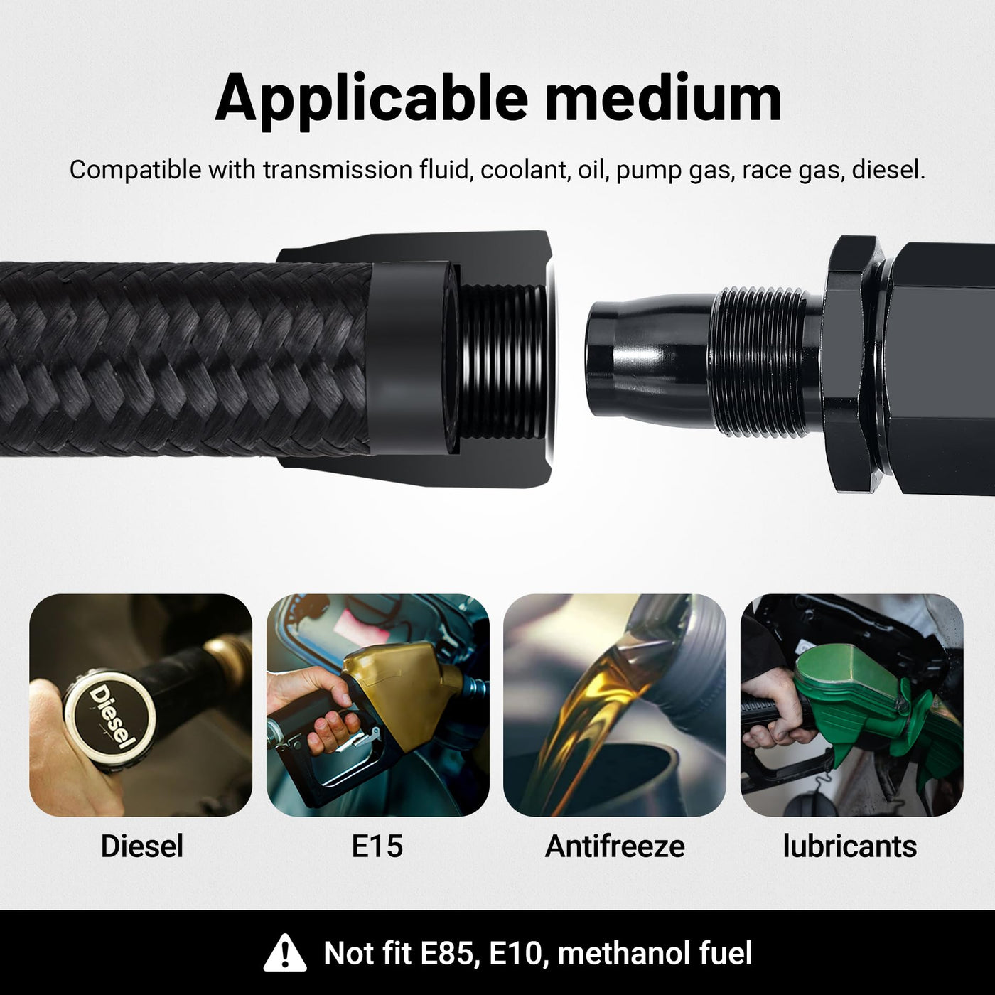 Q: Is the fuel line compatible with different types of fluids?A: Yes, the nylon braided fuel line is compatible with diesel, gasoline, coolant, transmission fluid, oil, and vacuum, providing versatility for various automotive applications.