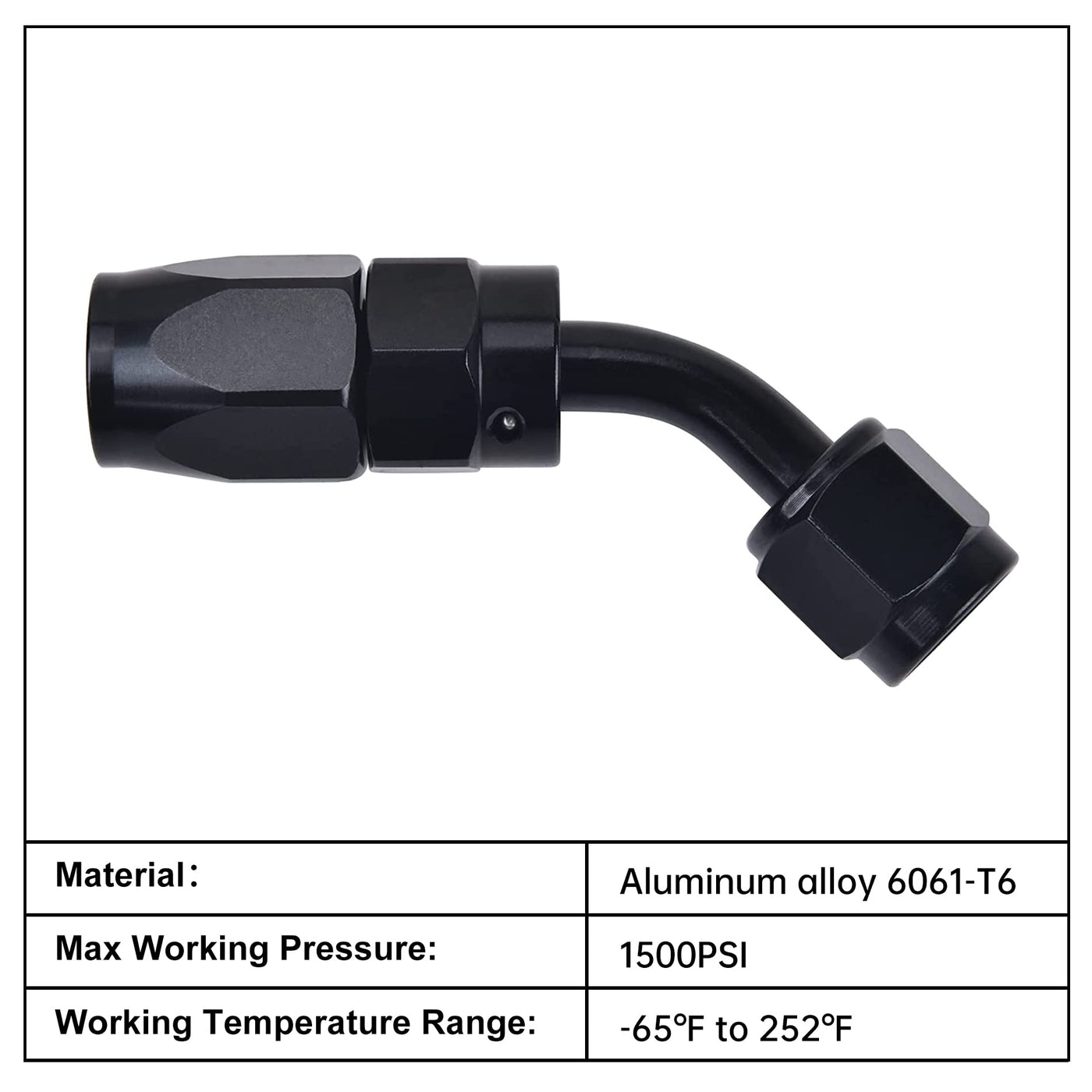 Q: What is the maximum working pressure and temperature range for this fitting?A: This fitting has a maximum working pressure of 1500 PSI and can operate within a temperature range of -65℉ to 252℉ (-53℃ to 122℃).