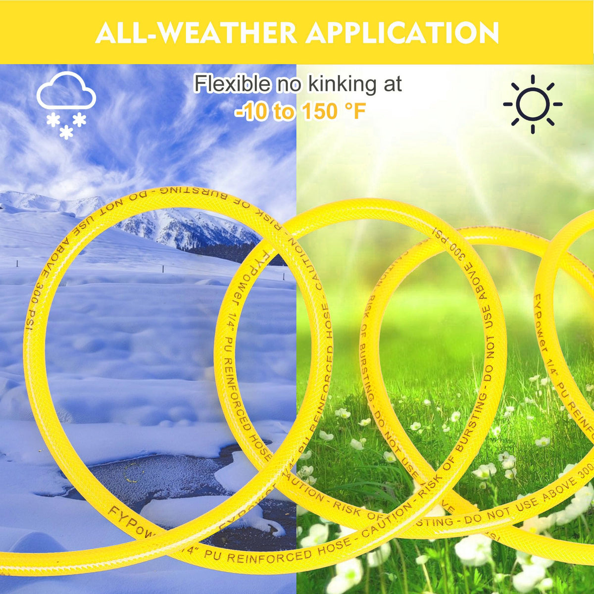 Q: Is the FYPower Air Compressor Hose suitable for outdoor use?A: Yes, the FYPower Air Compressor Hose is constructed from reinforced polyurethane materials, providing all-weather flexibility and allowing it to remain pliable in temperatures ranging from -10°F to 150°F.
