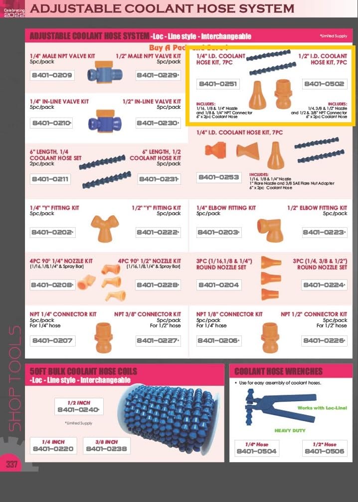 1/2'' I.D. Coolant Hose Kit with 6'' Hoses ~ Includes 1 piece each o f1/4, 3/8 & 1/2'' nozzles and 1/2 & 3/8'' NPT Connectors ~ Also includes 2 pieces of 6'' Coolant Hoses ~ Compatible with Loc Line.