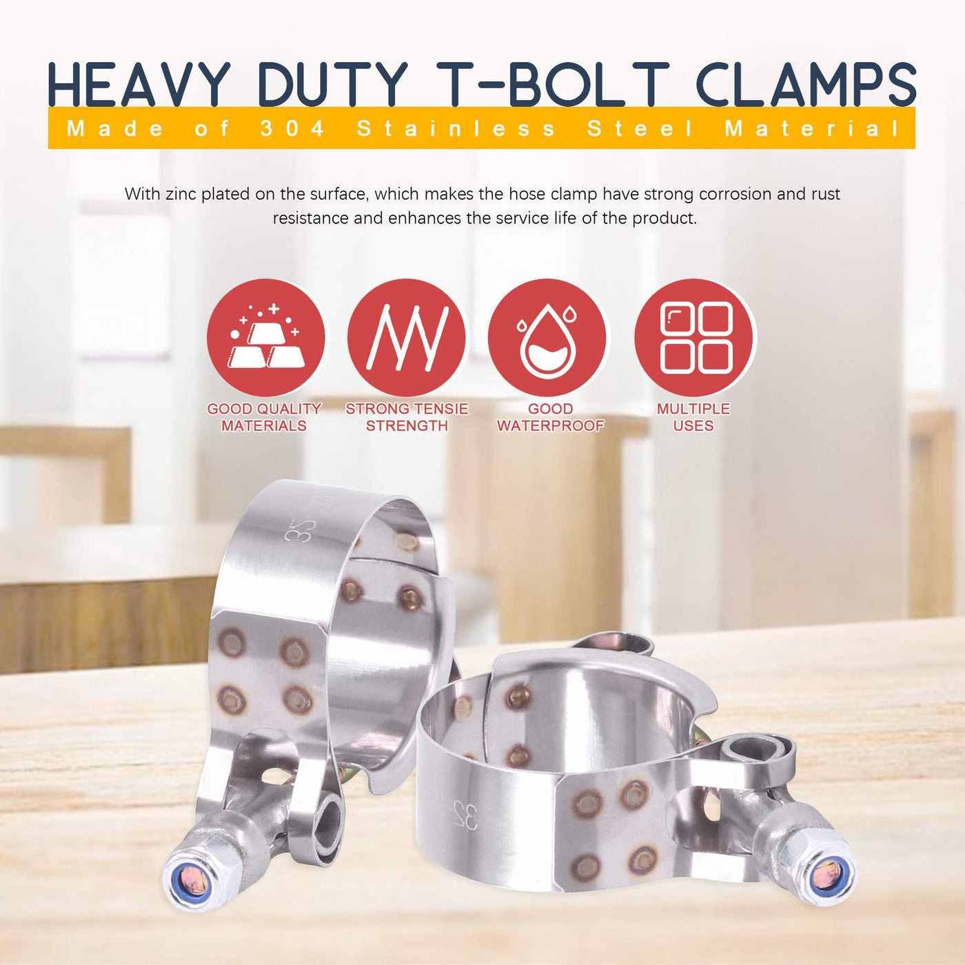 Hilitchi 2Pcs Stainless Steel T-Bolt Clamps with Rounded Band Edges Heavy Duty Turbo Intake Intercooler Clamp (76-84MM) for 3 1/4 Inch FEATURES: Focusing on quality and with fine buffing Smooth surface without burr Good tightening effect, durable, no rust, corrosion resistance Smooth and no uneven marks Complete model Removable installation and reusable Specification Product Type: T-Bolt hose clamp Material: Stainless steel Size: 76-84mm Number of items: 2Pcs