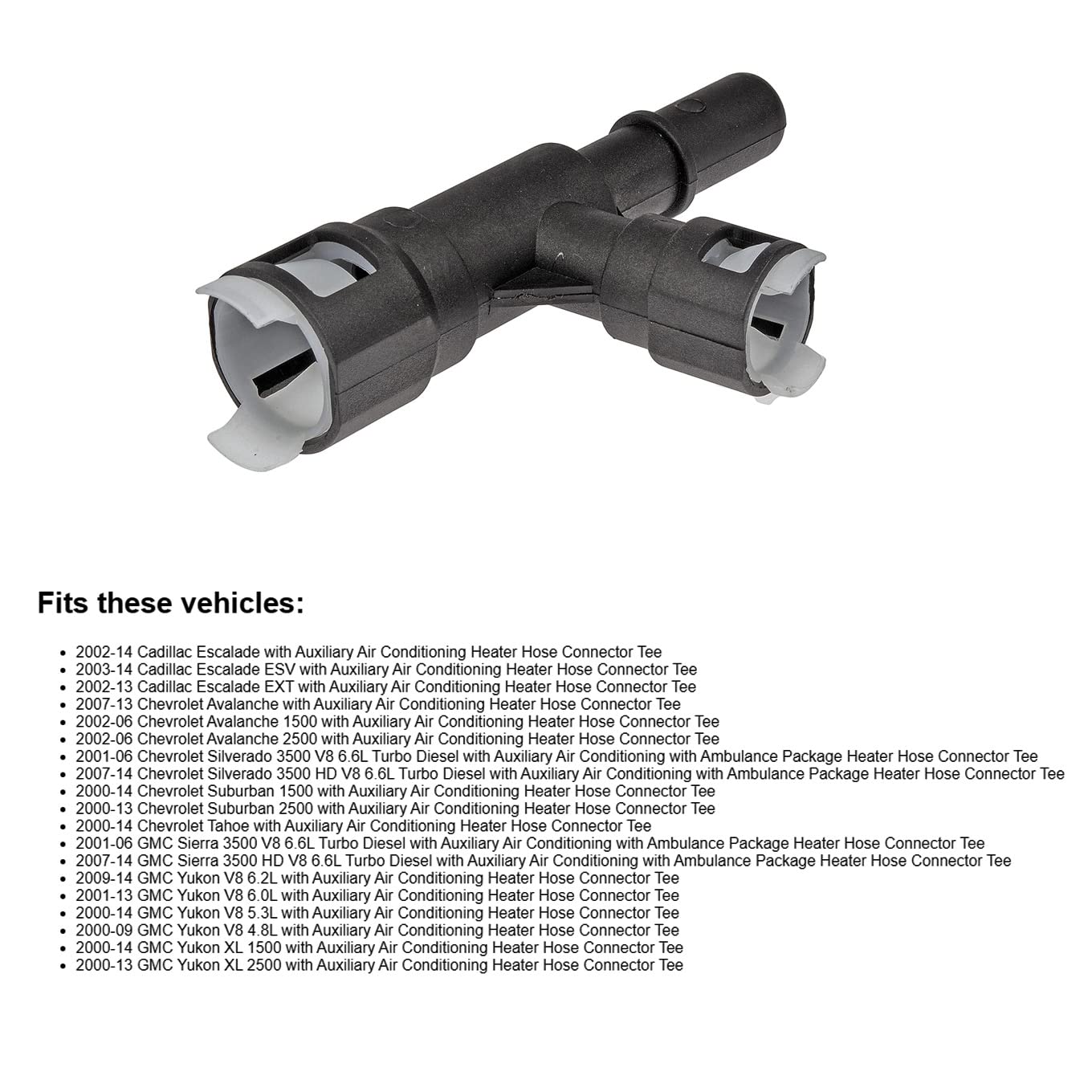 Q: What vehicles are compatible with the HVAC Heater Hose Assembly 15145587?A: The HVAC Heater Hose Assembly 15145587 is compatible with select Cadillac, Chevrolet, and GMC models including the Cadillac Escalade (2002-2006), Chevrolet Suburban (2000-2006), Chevrolet Tahoe (2000-2006), and GMC Yukon (2000-2006).