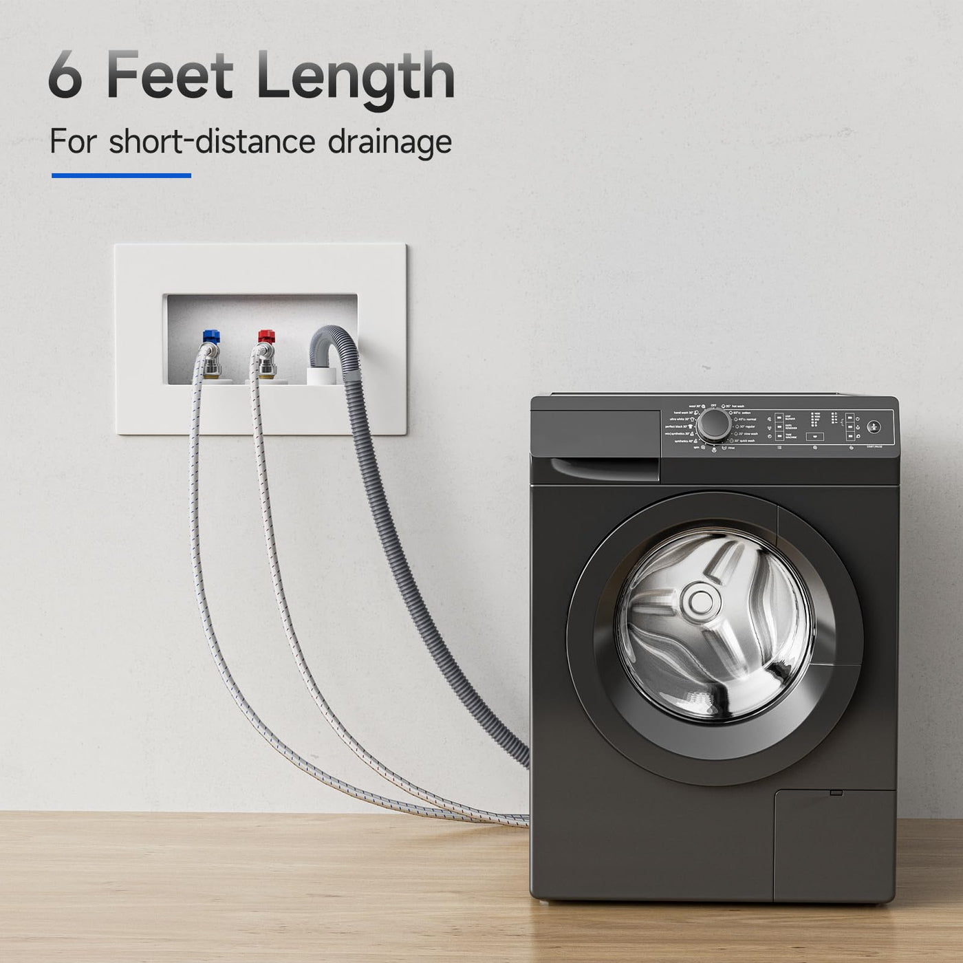 Q: What is the length of the JUWO washing machine drain hose?A: The JUWO washing machine drain hose measures 6 feet in length, providing ample reach for short-distance drainage to sinks or drain pipes.