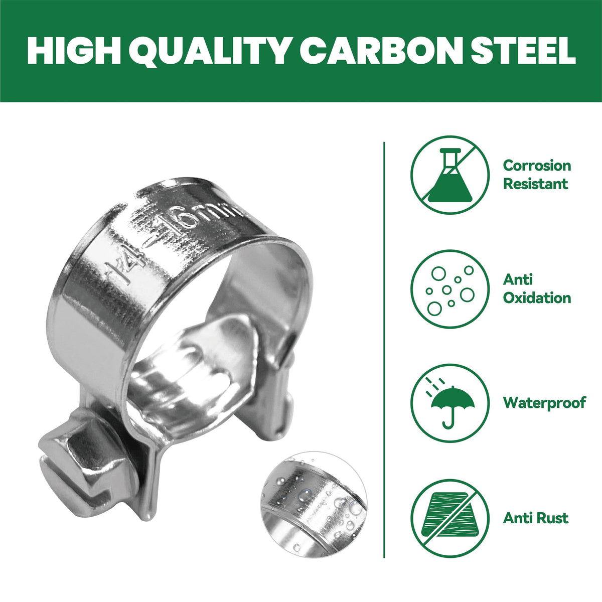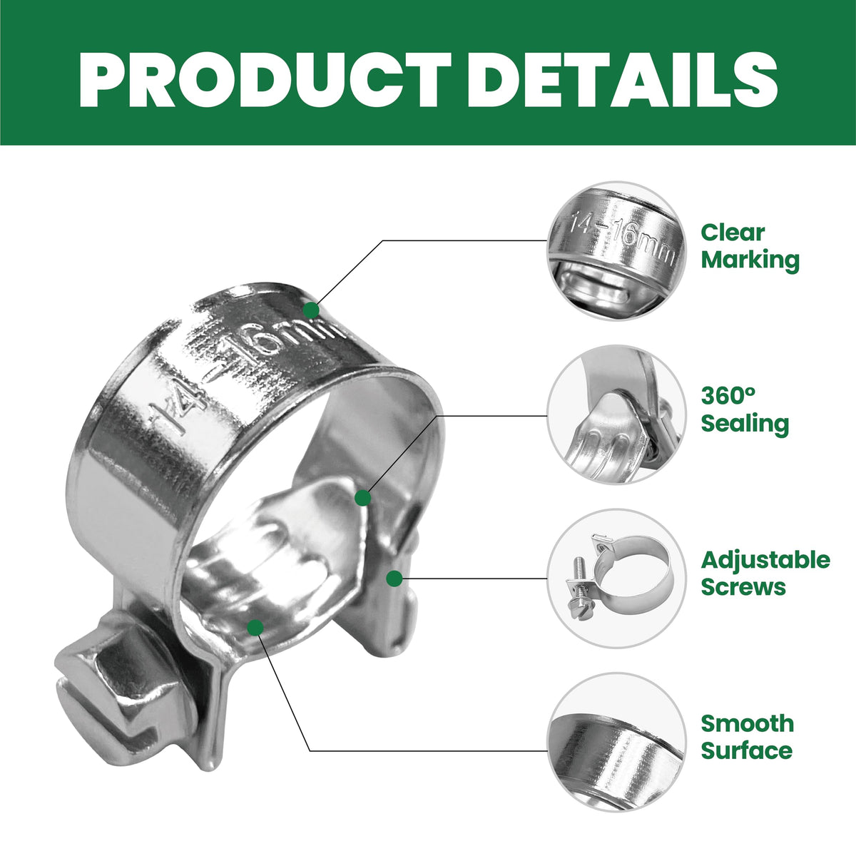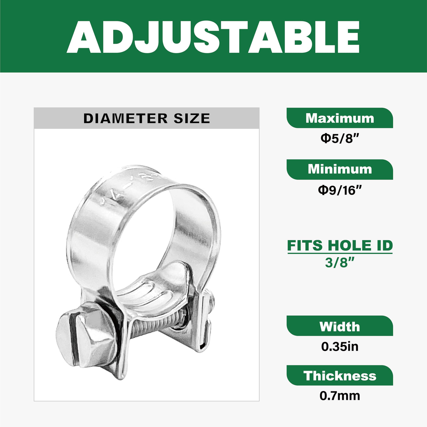 Designed for use on 3/8'' ID Fuel Injection Hose.PACKAGE INCLUDES: 20pcs 3/8 inch mini injector hose clamps in a clear pvc bag, diameter 9/16''-5/8''(14-16mm), standard size. Featuring an internal one-slot, external hexagonal design. These hose clamps are supplied with adjustable screws for flexible adjustment to suit your needs for the product.ANTI-CORROSION MATERIAL: The Mini Heavy Duty Hose Clamps including screws and nuts are made of high quality galvanized steel, the galvanized coating can prevent corrosion and rust in humid environments. The surface of fuel hose clamp is burr-free, which will not scratch the pipes and is sturdy and durable when installed on the pipes. You never have to worry about rust and breakage. Can be used both indoors and outdoors!EASY to USE: Just loosen the screws of the hose clamps with a screwdriver, then pass the pipe through the hose clamps and tighten the screws according to your needs and fuel line size. The range of clamps shows the adjustable minimum and maximum sizes.VERSATILE USE: When you need to repair your diesel gasoline line, these powerful high pressure hose clamps are your first choice over standard hose clamps and traditional screw-on steel band type clamps. You can choose the right size according to the size to solve the problem of hose leakage. So they are widely used in pipeline repair, automobile repair, ships, industry, farms and so on.