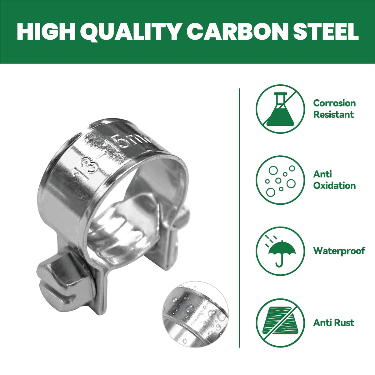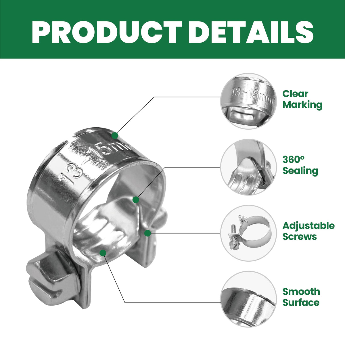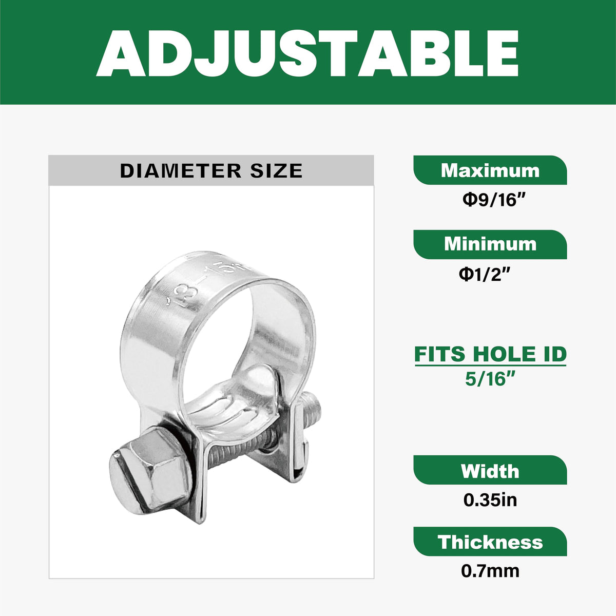 Designed for use on 5/16'' ID Fuel Injection Hose.PACKAGE INCLUDES: 20pcs 5/16 inch mini injector hose clamps in a clear pvc bag, diameter 1/2''-9/16''(13-15mm), standard size. Featuring an internal one-slot, external hexagonal design. These hose clamps are supplied with adjustable screws for flexible adjustment to suit your needs for the product.ANTI-CORROSION MATERIAL: The Mini Heavy Duty Hose Clamps including screws and nuts are made of high quality galvanized steel, the galvanized coating can prevent corrosion and rust in humid environments. The surface of fuel hose clamp is burr-free, which will not scratch the pipes and is sturdy and durable when installed on the pipes. You never have to worry about rust and breakage. Can be used both indoors and outdoors!EASY to USE: Just loosen the screws of the hose clamps with a screwdriver, then pass the pipe through the hose clamps and tighten the screws according to your needs and fuel line size. The range of clamps shows the adjustable minimum and maximum sizes.VERSATILE USE: When you need to repair your diesel gasoline line, these powerful high pressure hose clamps are your first choice over standard hose clamps and traditional screw-on steel band type clamps. You can choose the right size according to the size to solve the problem of hose leakage. So they are widely used in pipeline repair, automobile repair, ships, industry, farms and so on.