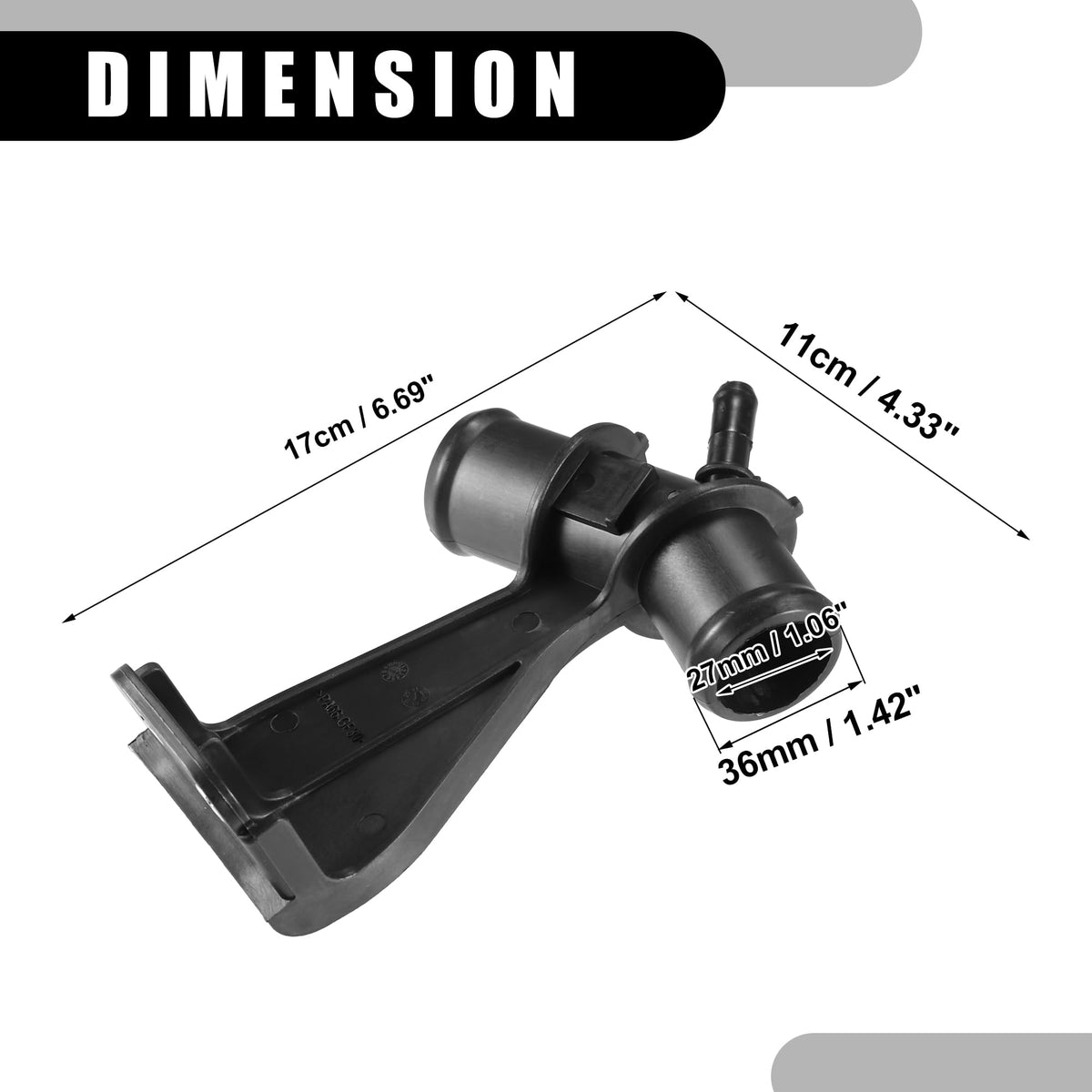 Q: What are the dimensions of the Partuto Engine Radiator Water Outlet Coolant Pipe?A: The dimensions of the Partuto Engine Radiator Water Outlet Coolant Pipe are 17x11x5 cm (6.69"x4.33"x1.97"). It has an outer diameter of 36 mm (1.42") and an inner diameter of 27 mm (1.06").