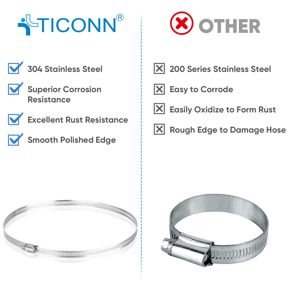 The Ticonn Hose Repair Clamps Set Is Ideal For Corrosive Applications Or Ones With Moisture Or Water Exposure. The Stainless Steel Finish Prevents The Hose From Corroding. Perfect For Plumbing Repairs, This Clamp Provides A Durable, Low-Maintenance Solution. Stainless Steel Finish For Lasting Durability Features Versatile Use With Hoses Made From A Variety Of Different Materials Easy To Install Prevents The Hose From Corroding Features A Worm-Drive Design And Punched Rectangular Perforations