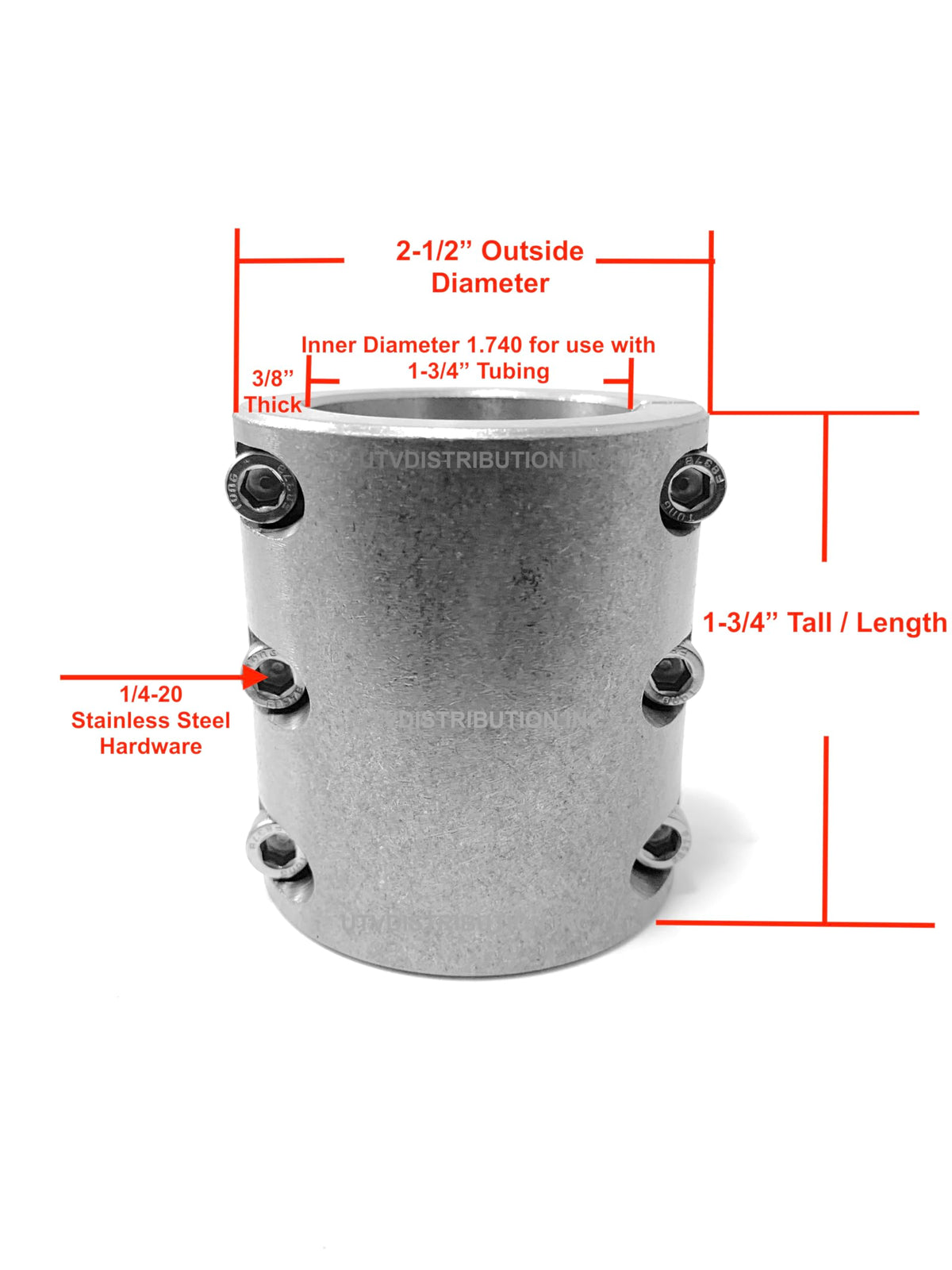 Universal Fabrication 1 3/4' Clamps to compliment all of your builds. Building a rollcage on any vehicle with 1 3/4' O.D.tubing- heres the clamps to add any bolt on feature for your project . We sell these to UTV /SXS and many other off-road fabrication shops. Features: -Solid cold rolled steel CNC machined parts-not cast. -Made for use with 1 3/4' O.D.Tube. -Clamp I.D. = 1.745' -Clamp O.D. = 2.5' - Clamp Length-2-3/4' Clamp Thickness= 3/8' -Come with 6 Stainless Steel Allen Bolts Clamps come in a set.(4 clamp halves with 8 bolts as pictured) -Great for race and recreational applications. Make your bumpers/spare tire carriers/roof racks/doors and many other items bolt on !