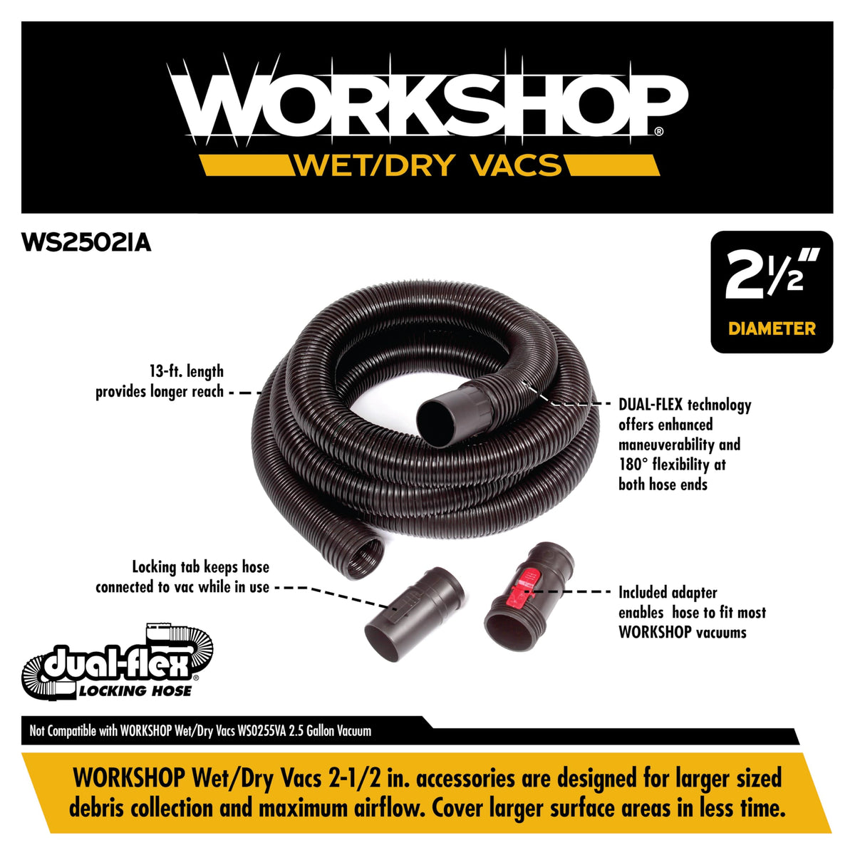 When a need exists to extend the reach of a shop vacuum this 13 foot wet dry vacuum hose is perfect. The 2-1/2-inch diameter provides a larger opening for debris collection and maximum airflow. This wet dry vac hose works with 1-7/8-inch and 2-1/2-inch shop vacuum accessories, and fits most shop vacuums with the standard 2-1/2-inch inlet port opening including most WORKSHOP Wet/ Dry Vacs.