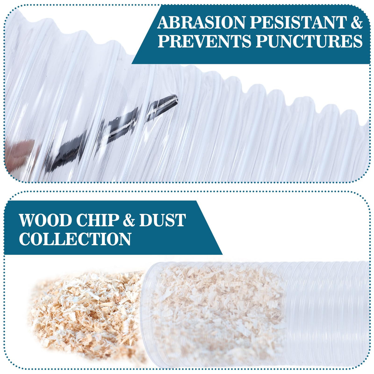 Q: How does the included stainless steel clamps enhance the performance of the hose?A: The included 8 stainless steel clamps ensure a reliable and snug fit, minimizing air leaks and maximizing suction efficiency for optimal dust collection performance.