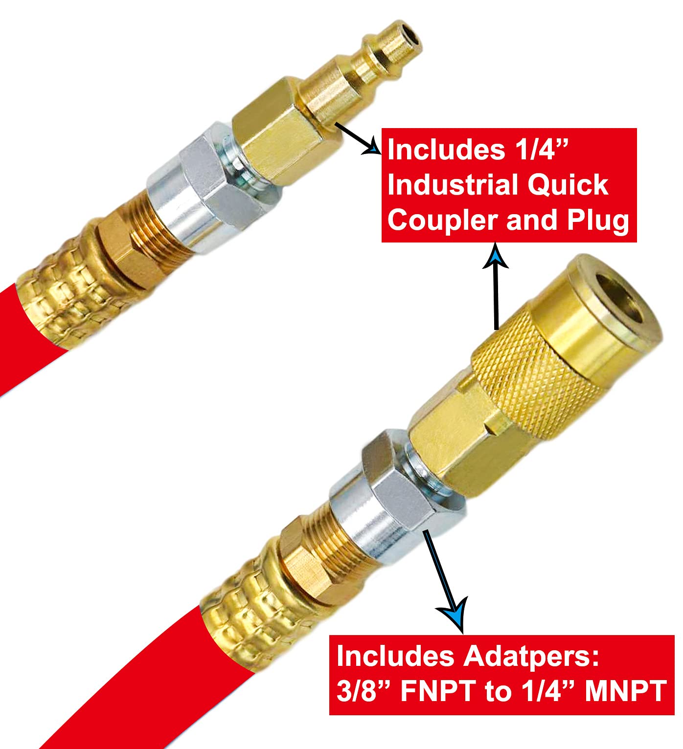 YOTOO 1/2'x50' Hybrid Air Hose is ideal for garage, shop, industry, home and many other uses. The Rubber/PVC blend construction offers heavy duty, lightweight,flexibility,abrasion resistance. It is very good cold weather flexibility and coils easily for storage. Including double brass 1/4' MNPT fittings installed quick coupler and plug. The max pressure of the air hose is 300 psi. bursting pressure is 1200psi.Bend restrictors reduce kinking and help to increase the life of the air hose.