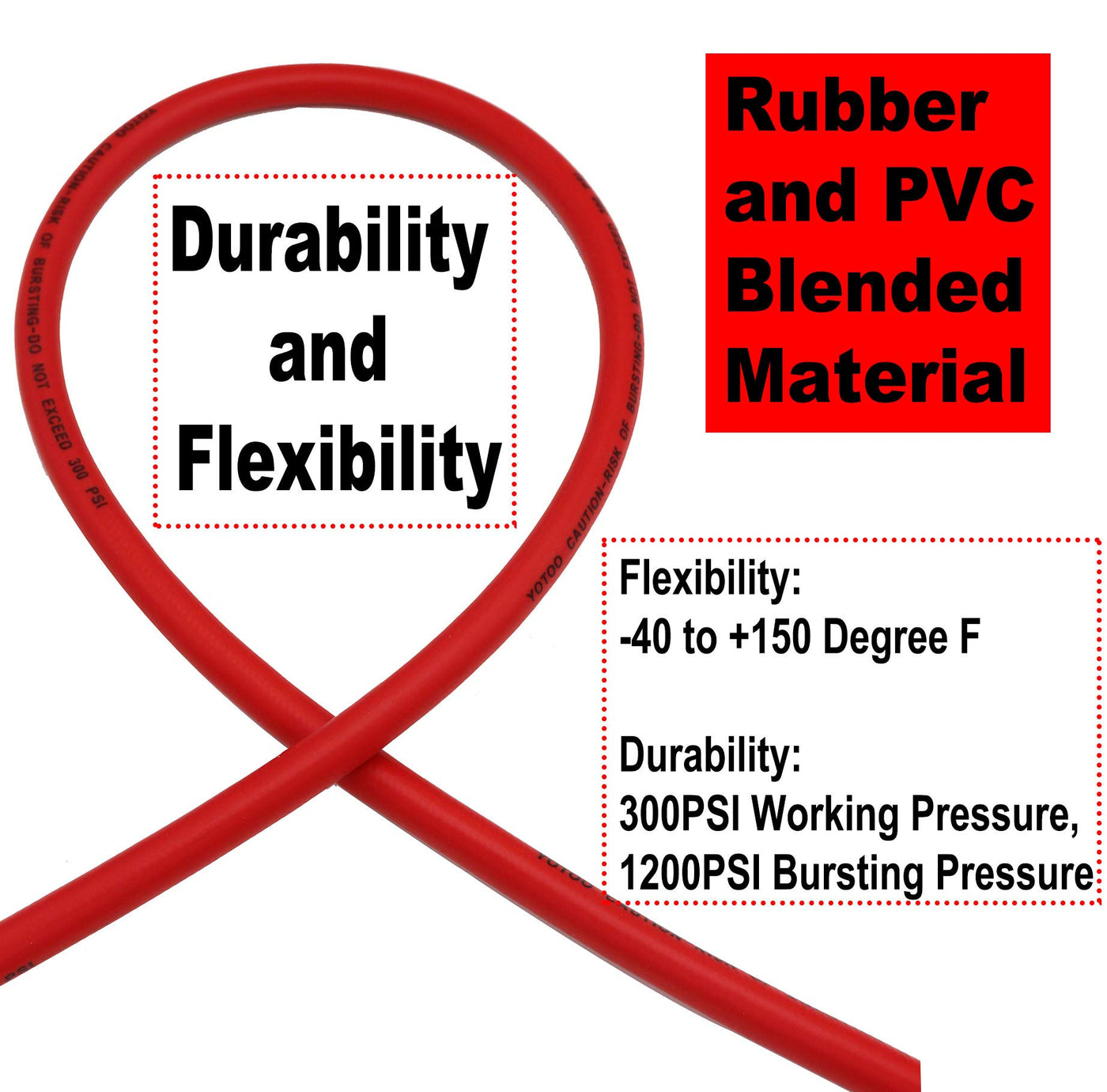 YOTOO 1/4'x50' Hybrid Air Hose ideal for garage, shop, industry, home and many other uses. The Rubber/PVC blend construction offers heavy duty, lightweight,flexibility,abrasion resistance. It is very good cold weather flexibility and coils easily for storage. Including double brass 1/4' MNPT fittings installed quick coupler and plug. The max pressure of the air hose is 300 psi. bursting pressure is 1200psi.Bend restrictors reduce kinking and help to increase the life of the air hose.