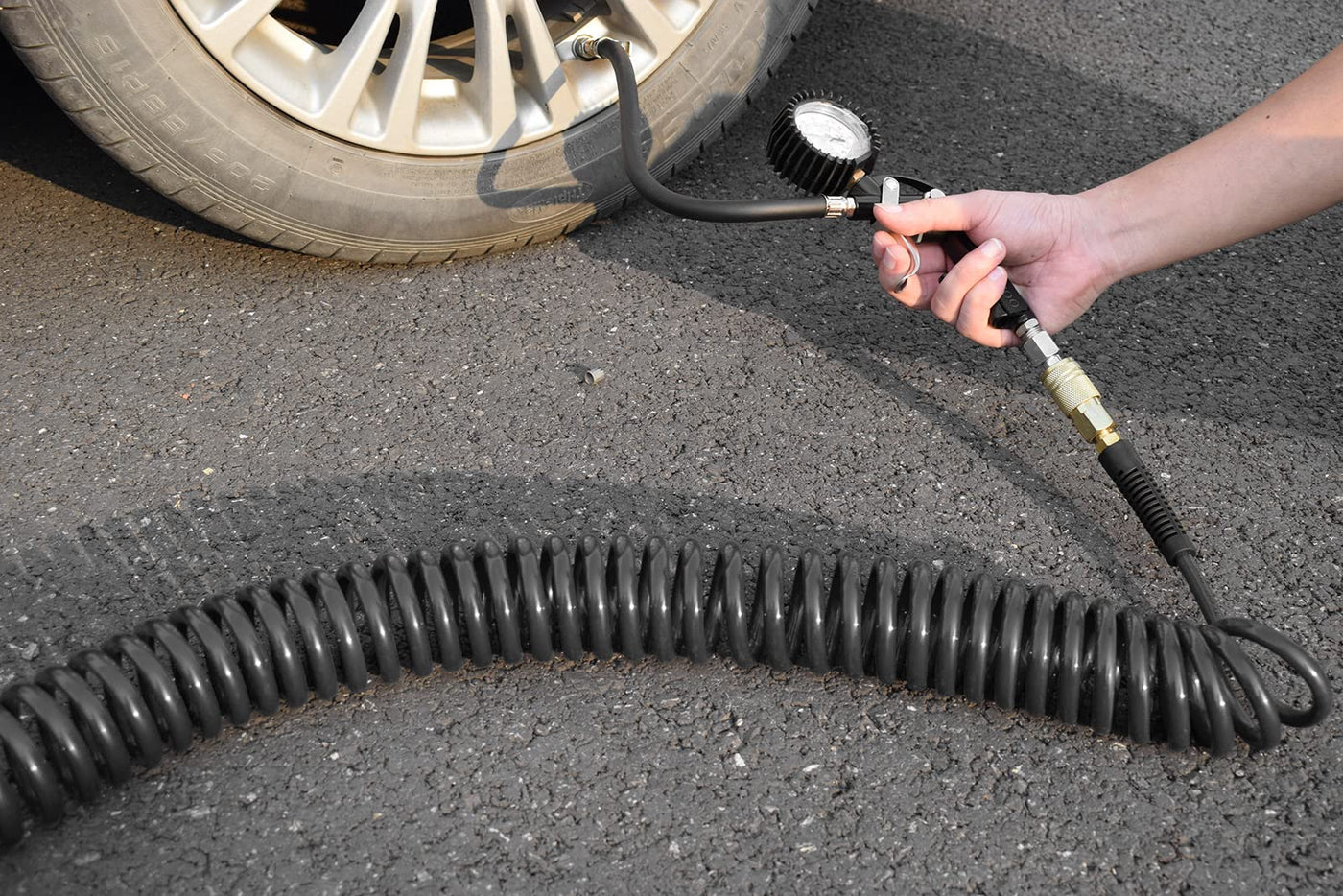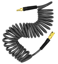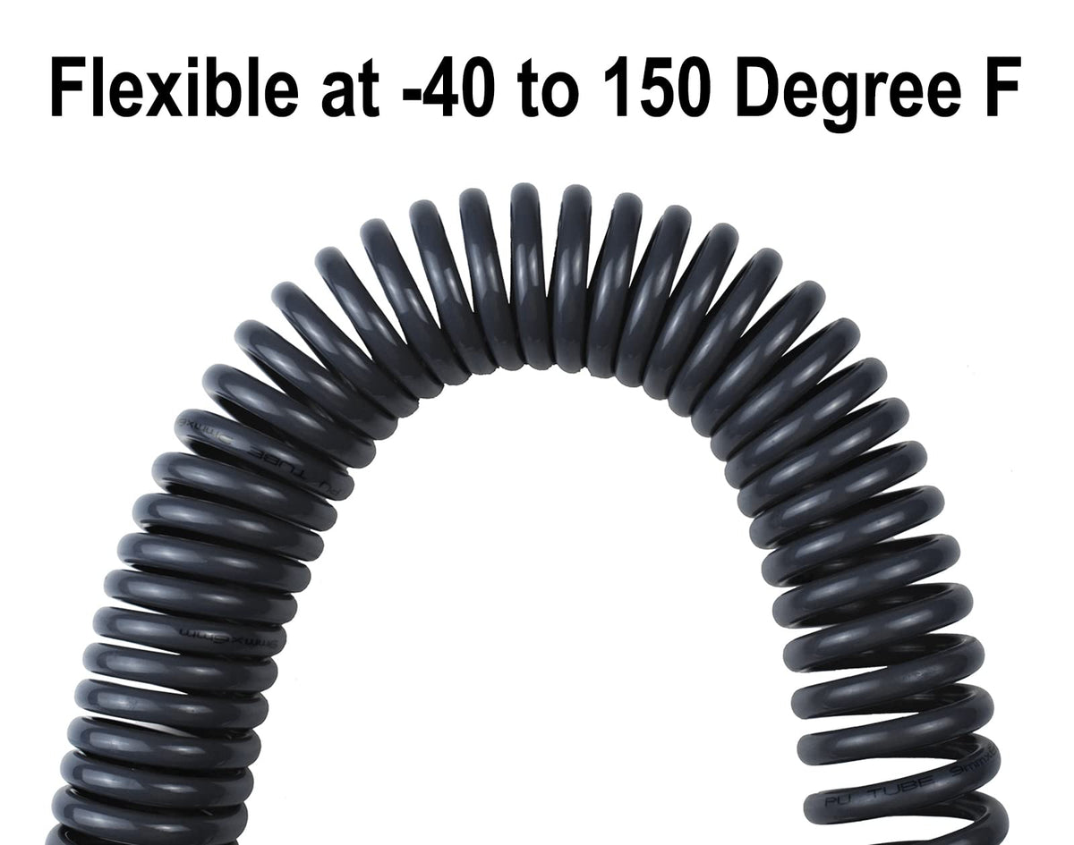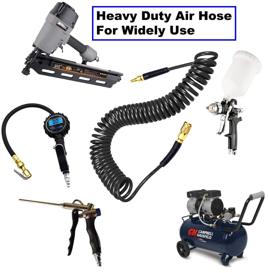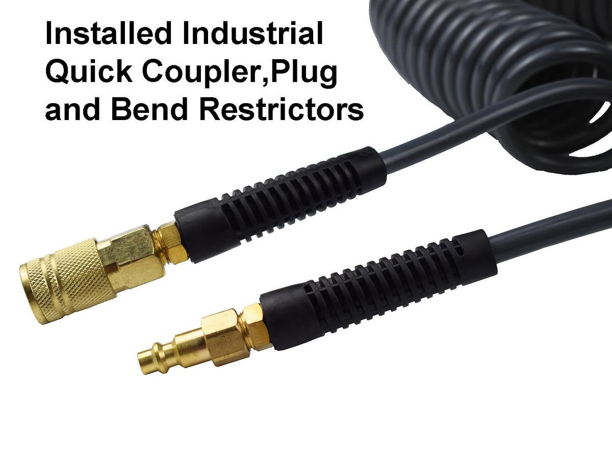 YOTOO Polyurethane Recoil Air Hose 3/8' Inner Diameter by 25' Long with Bend Restrictor, 1/4' Industrial Quick Coupler and Plug, Blue is made of polyurethane and has quick coupler and plug for attaching to air-powered tools and equipment for indoor or outdoor applications. The air hose has a pigtail-style body which self-recoils after extension during use. Bend restrictors reduce kinking and help to increase the life of the hose