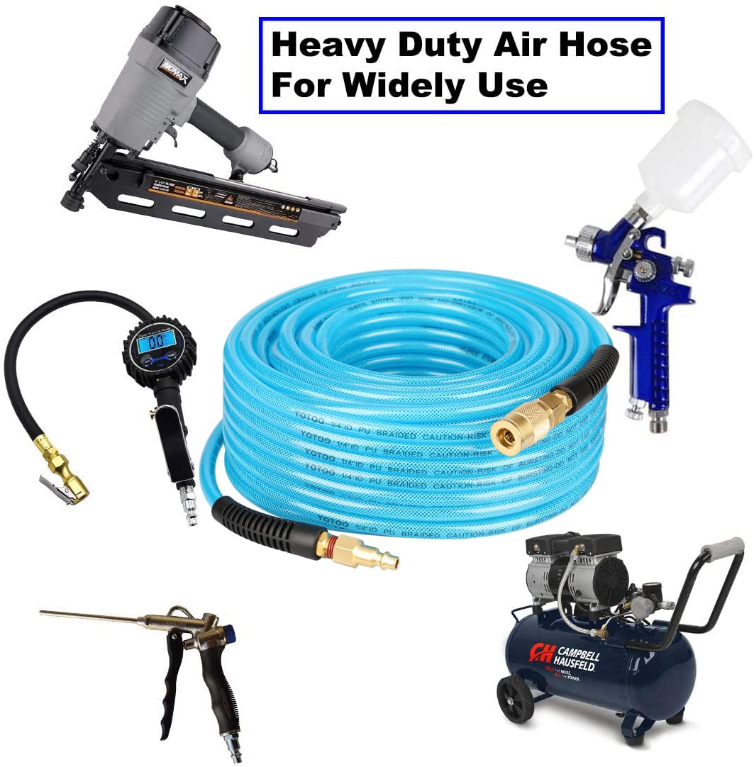 YOTOO Reinforced Polyurethane Air Hose 1/4' Inner Diameter by 100' Long, Flexible, Heavy Duty Air Compressor Hose with Bend Restrictor, 1/4' Swivel Industrial Quick Coupler and Plug, Blue