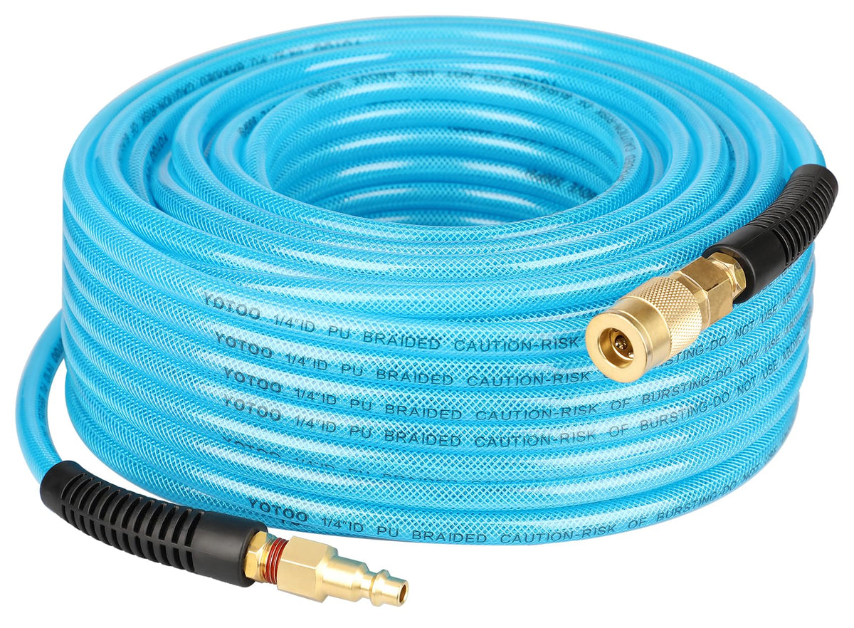 Q: What materials are used in the construction of this air hose?A: The YOTOO air hose is made from reinforced polyurethane, which provides excellent abrasion resistance, UV protection, and durability against oil and chemicals.