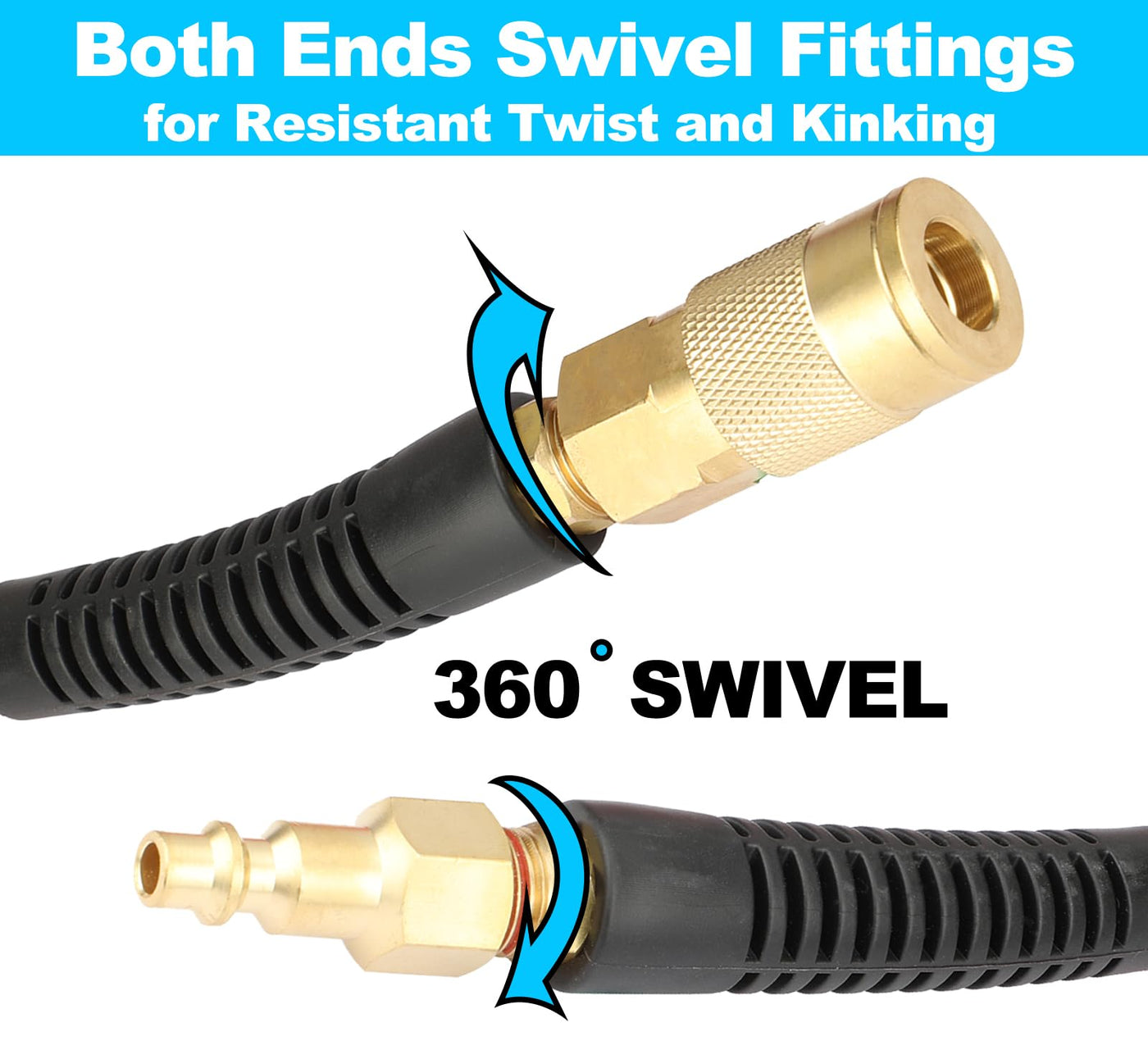Q: Does the air hose come with fittings for air compressor connections?A: Yes, the YOTOO air hose is equipped with a 1/4” industrial NPT quick coupler and plug, allowing for direct connection to air compressors and air tools without the need for separate fittings.