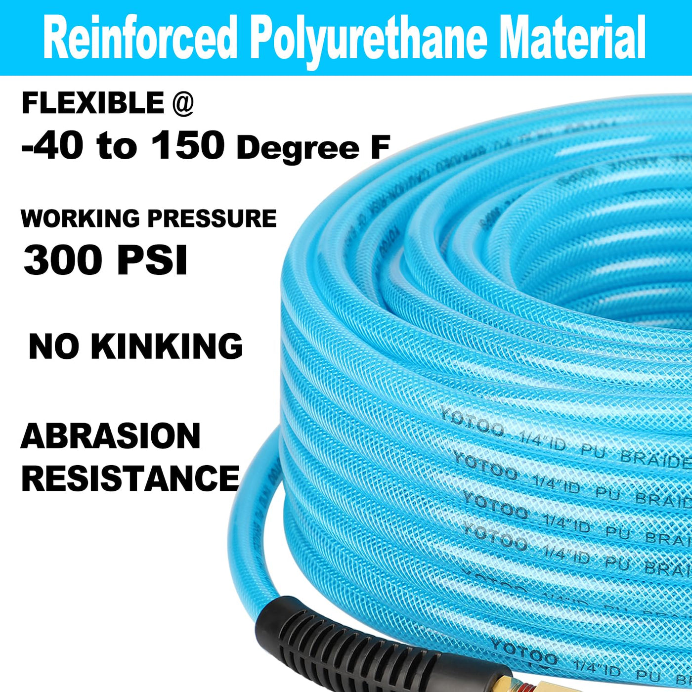 Q: What materials is the YOTOO air hose made of?A: The YOTOO Reinforced Polyurethane Air Hose is made from high-quality polyurethane material, which ensures resistance to kinking, abrasion, UV radiation, oil, chemicals, and heat.