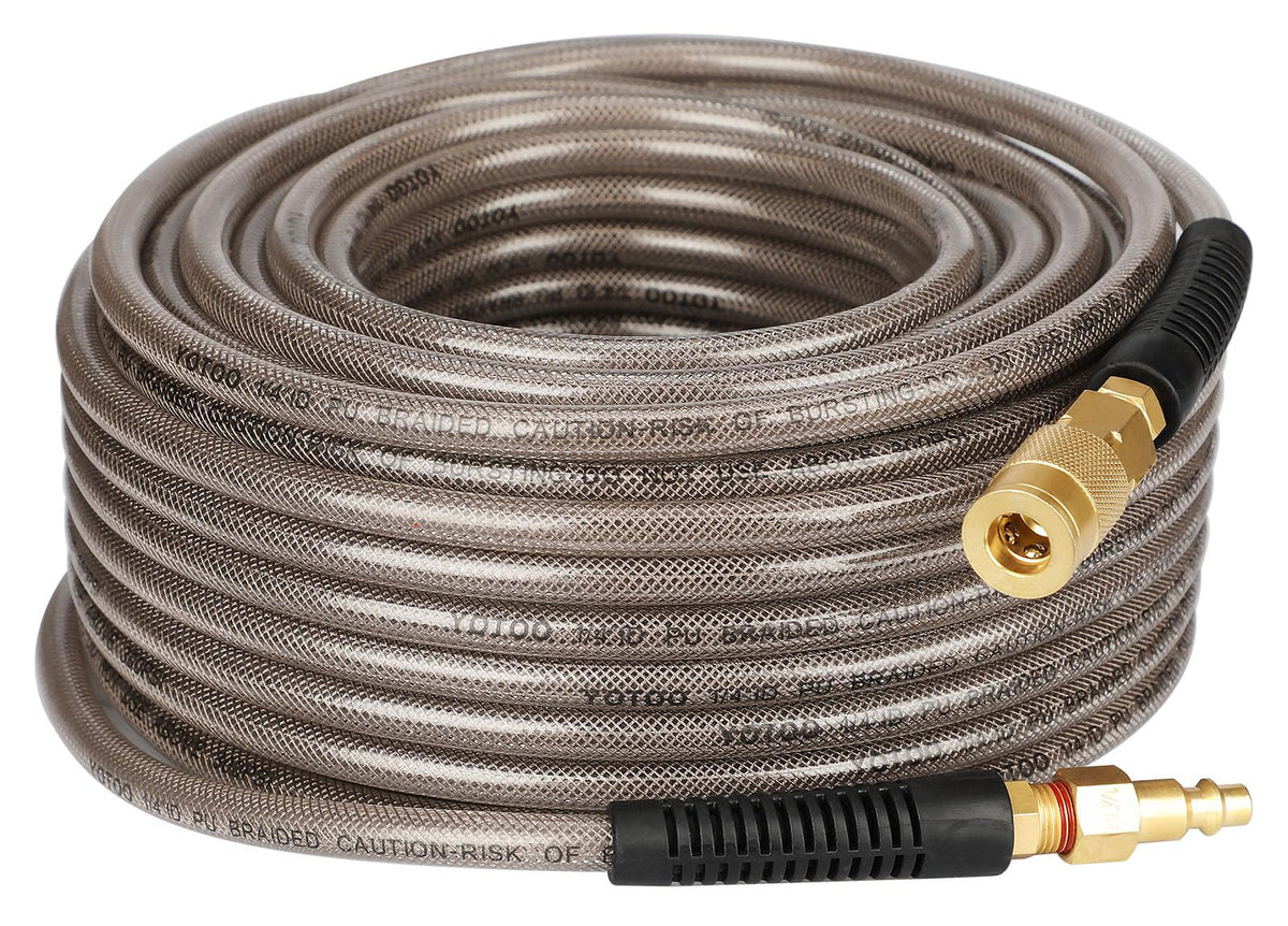 Q: What materials are used in the construction of this air hose?A: The YOTOO air hose is made from reinforced polyurethane, which offers excellent abrasion resistance, UV protection, and overall durability.
