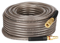 This reinforced polyurethane air hose is 1/4-Inch inner diameter by 50-Feet long. It is made of polyurethane material which makes this air hose resists kinking, abrasion, UV radiation, electricity, oil, chemicals and heat. 150 PSI working pressure. Flexible at -40 to +150 degree F. This air hose is also Installed 1/4' heavy duty industrial quick coupler and plug for convenient to contact air compressor and air tools. The bend restrictors reduce kinking and help to increase the life of the hose