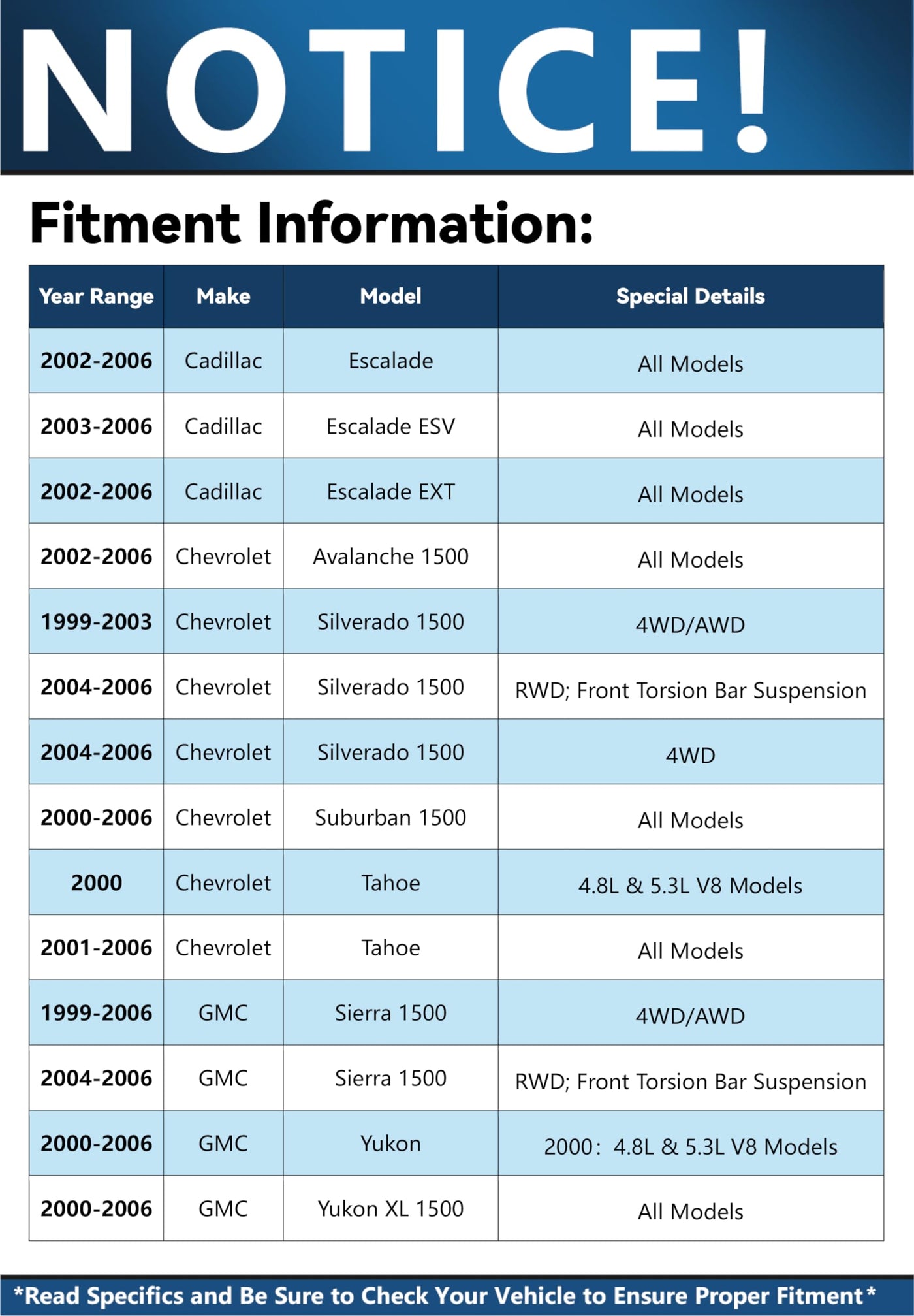 Kit Includes: 2x Front Upper Control Arm + Ball Joints - K80942 2x Front Inner Tie Rod Ends - ES3488 2x Front Outer Tie Rod Ends - ES3493T 2x Front Lower Ball Joints - K6541 Fitment: Replacement for 2002-2006 Cadillac Escalade Replacement for 2003-2006 Cadillac Escalade ESV Replacement for 2002-2006 Cadillac Escalade EXT Replacement for 2002-2006 Chevrolet Avalanche 1500 Replacement for 1999-2006 Chevrolet Silverado 1500 (4WD/AWD)Replacement for 2000-2006 Chevrolet Suburban 1500 Replacement for 2000 Chevrolet Tahoe (4.8L & 5.3L V8 Models) Replacement for 2001-2006 Chevrolet Tahoe Replacement for 1999-2006 GMC Sierra 1500 (4WD/AWD)Replacement for 2000 GMC Yukon (4.8L & 5.3L V8 Models) Replacement for 2001-2006 GMC Yukon Replacement for 2000-2006 GMC Yukon XL 1500 Introduction: Detroit Axle is a leading global retailer and distributor of OE re-manufactured and new aftermarket auto parts. We are committed to providing first-class products and outstanding customer service at an incredible value. Our rapidly-expanding product line includes CV Axles, Wheel Hub & Bearings, Suspension & Chassis parts, Complete Strut Assemblies, Shock Absorbers, Drilled & Slotted Brake Rotors, Conventional Brake Rotors, Ceramic Brake Pads, Rack & Pinion Assemblies, Gearboxes, Drive Shafts, and more.