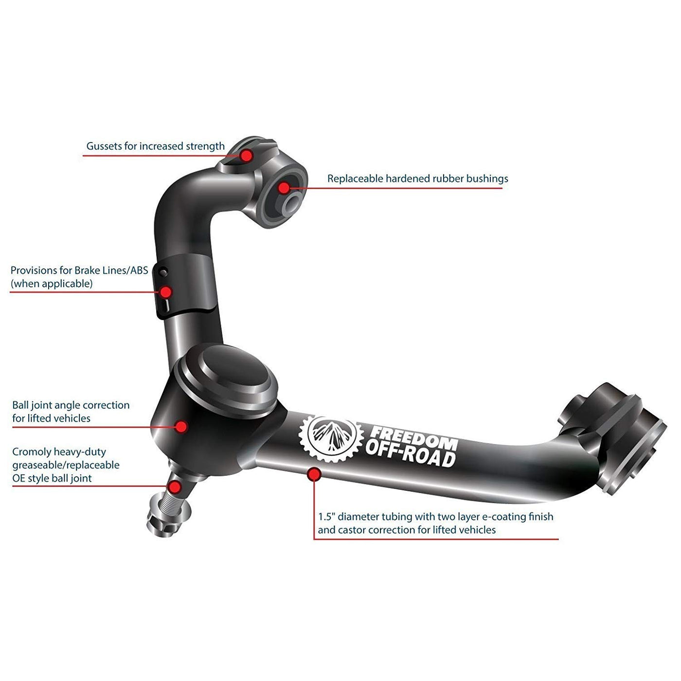 Q: How do I install the Freedom OffRoad Front Upper Control Arms?A: Installation typically requires basic hand tools and mechanical knowledge. It's recommended to follow a detailed installation guide or consult a professional for best results.