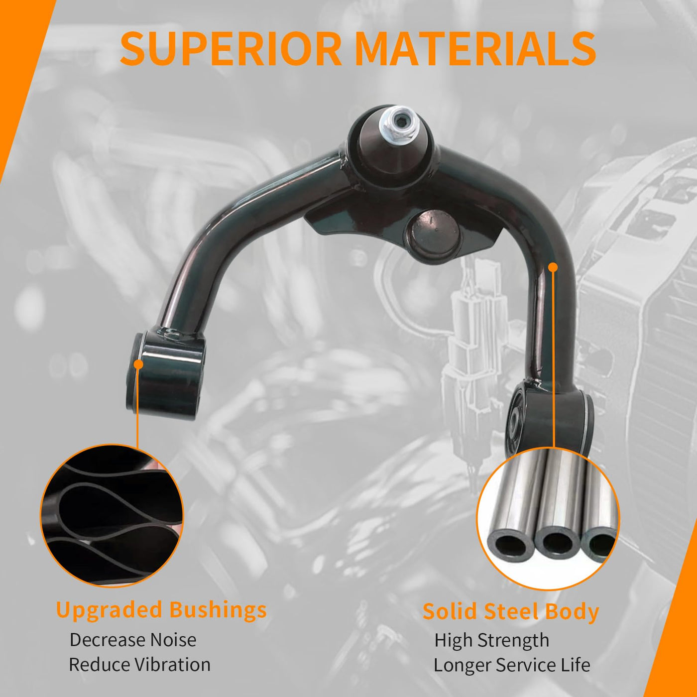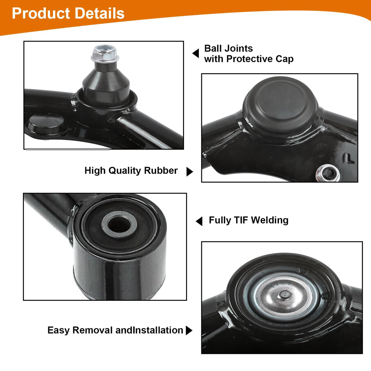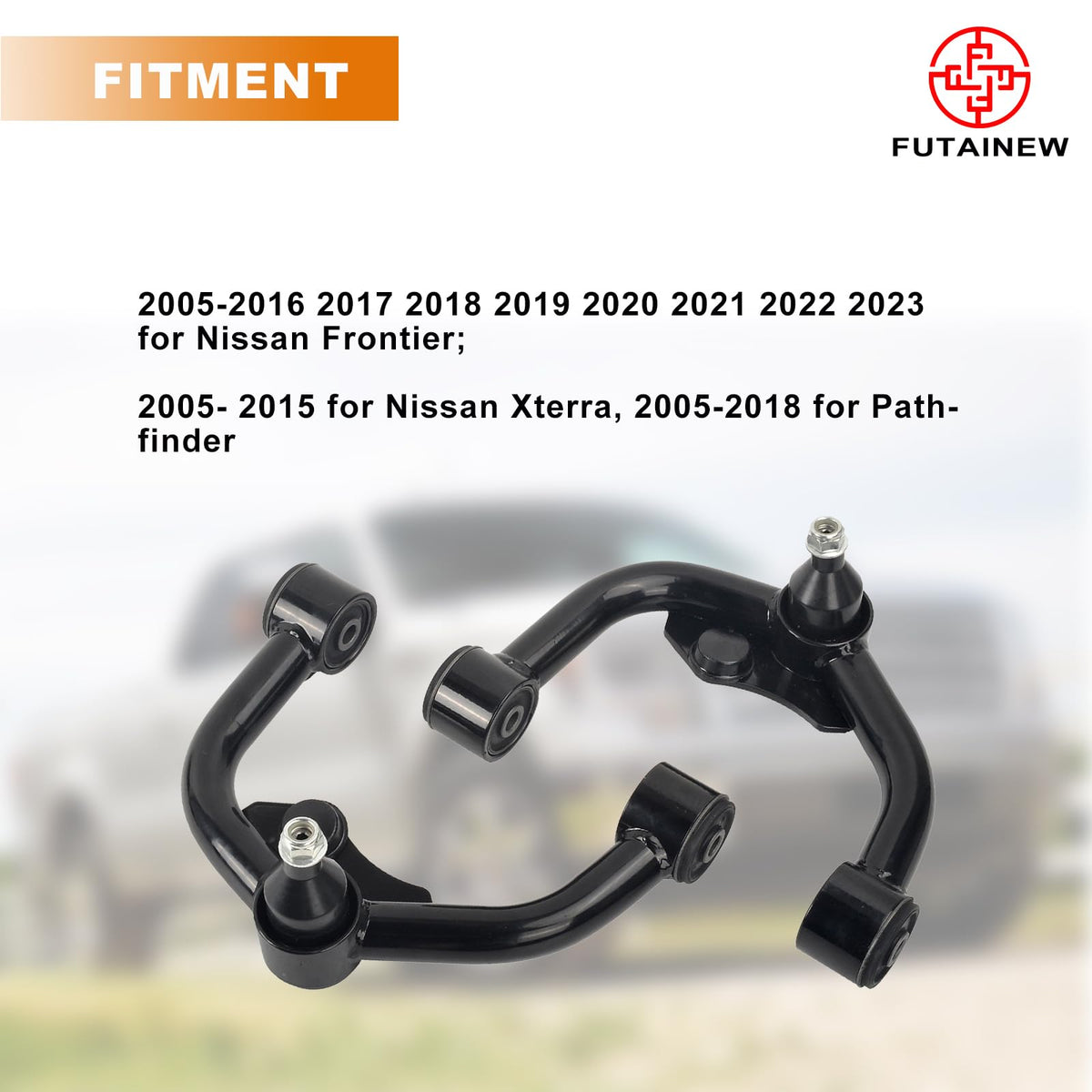 Fitment: 2005 2006 2007 2008 2009 2010 2011 2012 2013 2014 2015 2016 Nissan Frontier, 2005 2006 2007 2008 2009 2010 2011 2012 2013 2014 2015 2016 2017 2018 2019 2020 2021 Pathfinder, 2005 2006 2007 2008 2009 2010 2011 2012 2013 2014 2015 2016 Xterra Features: 1) Built to strict quality control standards 100% factory tested. 2) The control arms are an upgraded version of the original parts and are perfectly compatible with the original wheels. Replaced better OEM control arms that lift the vehicle 2-4 inches. 3) Welding mainly adopts TIG welding supply better stable and reinforced structure than MIG welding, weld forms Perfectly, and the safety performance has been more enhanced. 4) The front upper control arm with ball joint assembly is made of high-strength steel with solid mounting bracket. CNC machined,Unparalleled strength and durability, no welding weakness. The ball joint provides rotary movement between the steering joint and the control arm, providing safe and smooth driving. 5) With a protective cover to prevent liquid and road dirt from entering the ball joint during driving and extend the service life of the ball joint. 6) Polyurethane bushing has large torque and high strength, which improves driving performance and longer service life Instruction is not included. Professional installation is highly recommended. Please test in an empty area before getting back on the road.