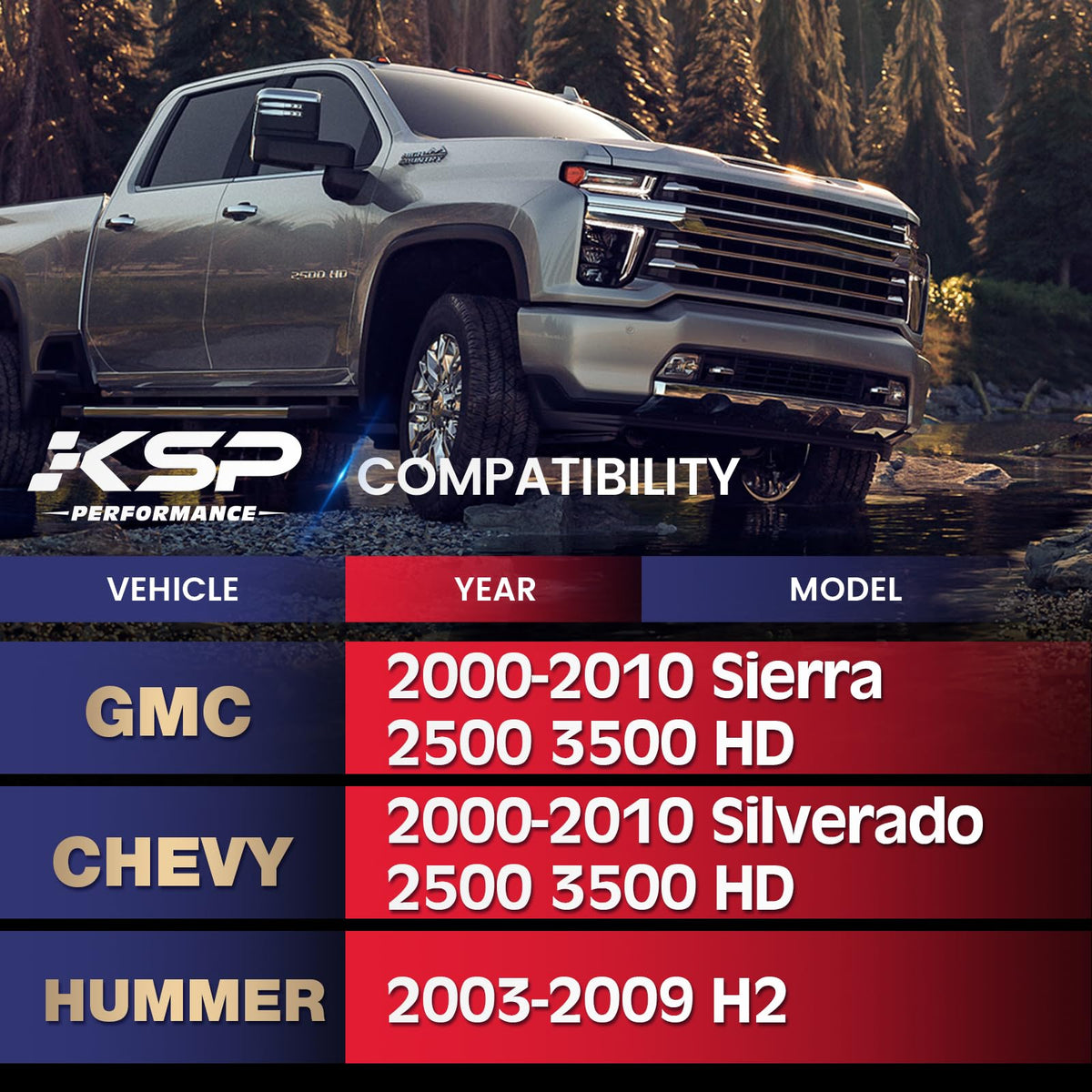 ***KSP PERFORMANCE Suspension arms W/H High Quality Guarantee*** 100% brand new Professional installation is highly recommended Installation Instruction is not included Include 1 pair kit and hardware as shown in pictures No returns or exchange once installed COMPATABILITY:(Please check your vehicle compatibility BEFORE buying): Fit for 2000-2010 sierra 2500 3500 HD 2000-2010 silverado2500 3500 HD2003-2009 Hummer H2 Measuring Guide: Measure your stock front and rear heights from the ground to bottom of the trim. The style of level or lift will determine how much height you will need to add to the front or rear. To level your vehicle, add a lift amount equivalent to the difference between front and rear heights. To lift your vehicle - while retaining the stock look, add the same lift amount to both front and rear. To level lift your vehicle, add the amount of lift you'd like for the front to the difference between front and rear stock heights and use this for your rear lift. For example: if your stock height for the front is 23'' and rear is 26'' to level - add 3'' lift to the front or to lift all corners 2'' - add 2'' to both front and rear.