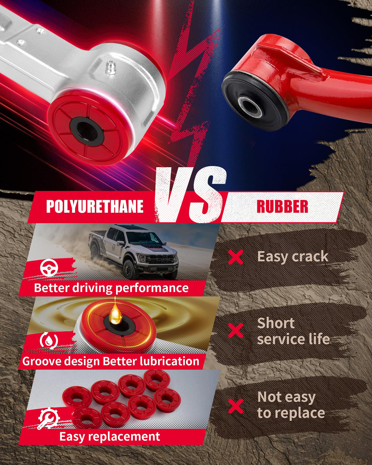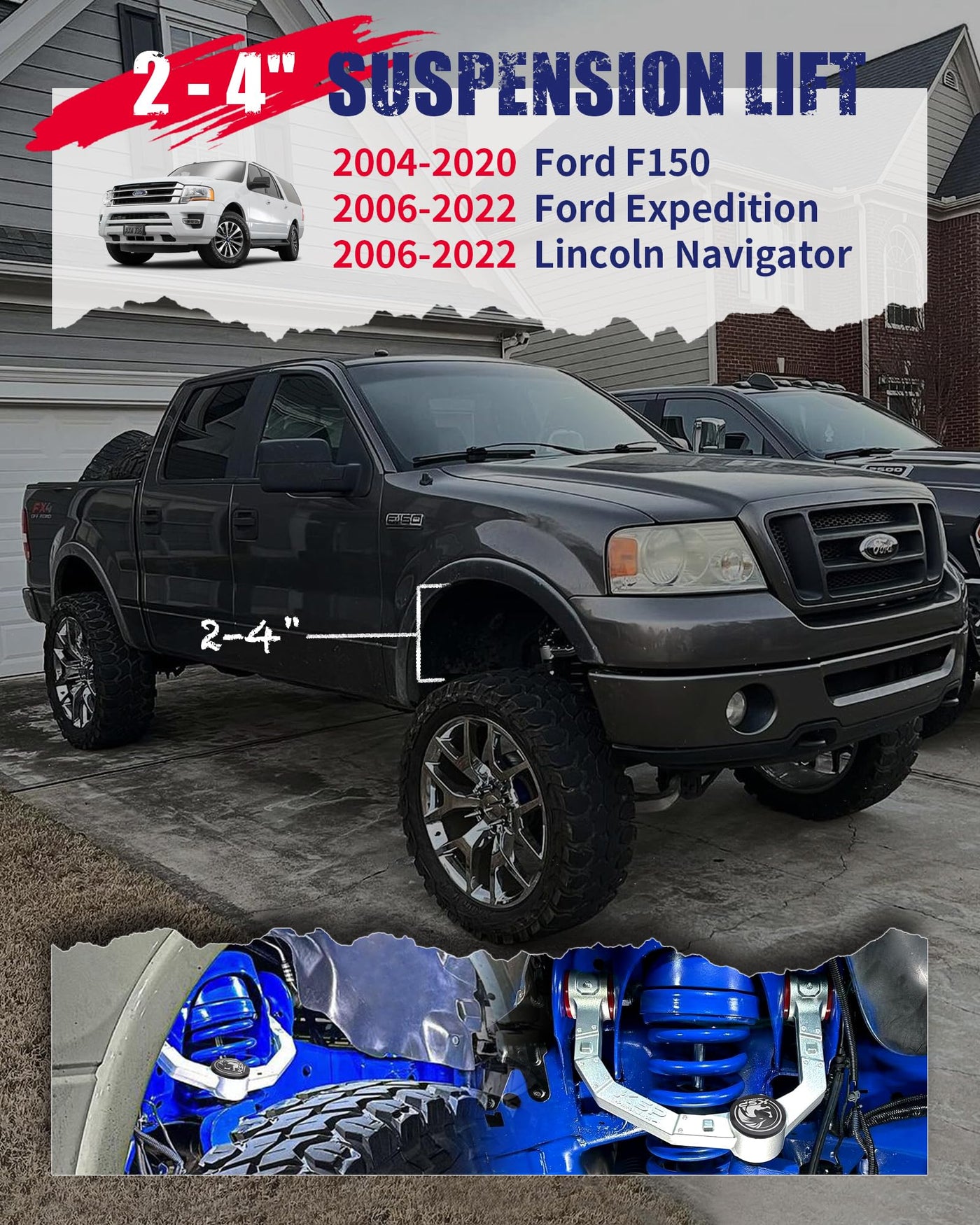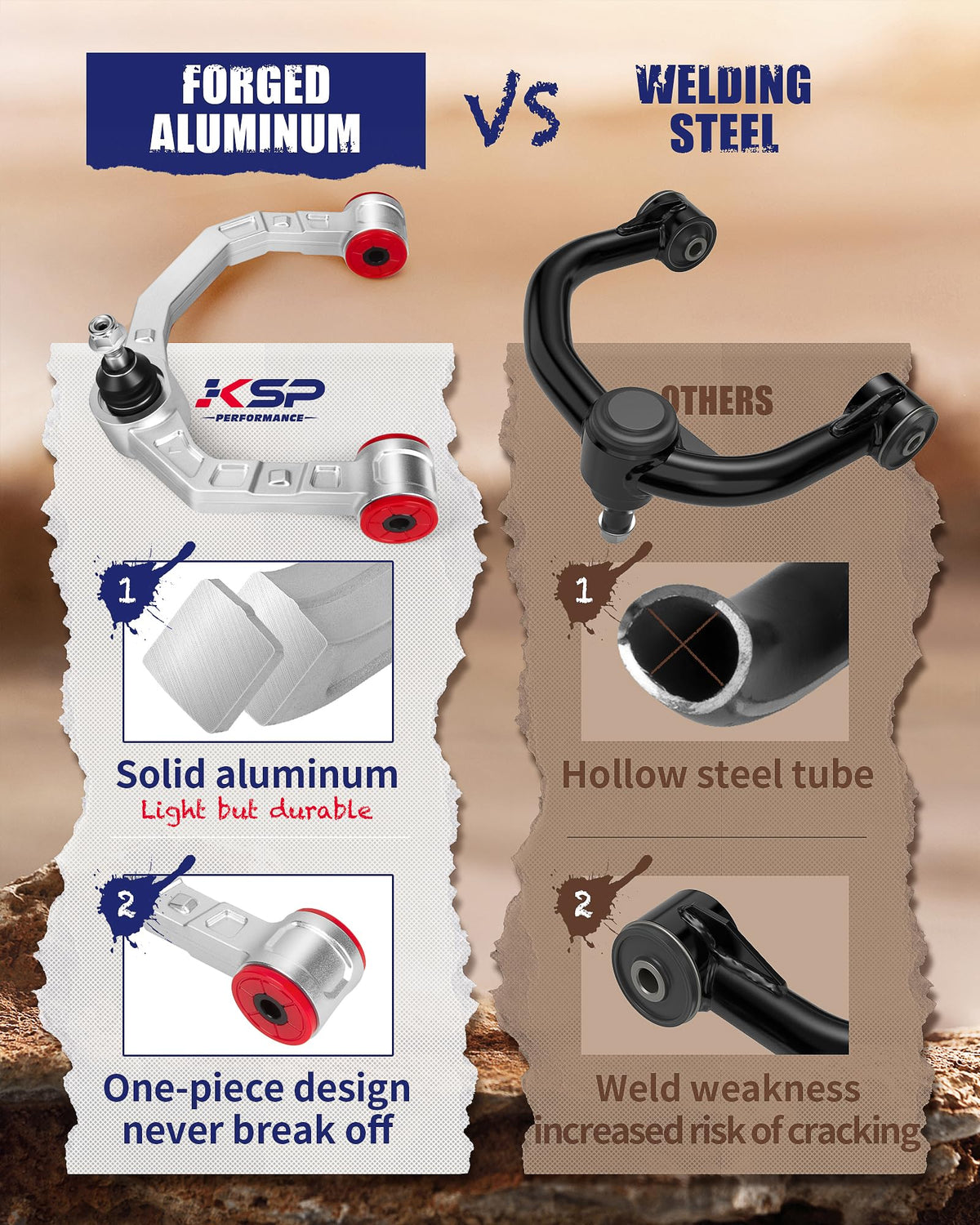 KSP pair of upgraded heavy duty forged 1 piece front upper control arms.Unsurpassed Strength and Durability Feature: 1.Equipped with dust cover to prevent sediment from entering and extend the service life of the ball joint; 2.The ball pin has a hex hole for easy installation 3.High quality professional ''TOWER'' dust boots, better than FACTORY.Pre-installed dust boot shields socket components from wear-causing contaminants 4.Made of T6 forged aluminum with CNC machining, lighter quality, no welding defects and welding weak points, higher strength, more solid. 5.Greasable socket reduces corrosion and wear by allowing new lubricant to flush 6.The polyurethane bushings improves vehicle handling and service life, suitable for high temperature and low temperature weather. 7.The forged control arm has the exclusive logo of''KSP'' Vehicel Compatible: 2004-2020 F-150 2006-2022 Expedition 2006-2022 Navigator Important notice; If the control arm rubber against on the factory rim,there are two method to solve the problem. (1)Add a spacers to increase the space between the hub and tire (2)Grind down the thickness of KSP's control arms a bit to fix it. Since the control arms are forged from solid aluminum, grinding them down slightly won't affect their strength or appearance. If had been friction between control arm and wheels after 3inch lift, add a spacers will solve the problem.